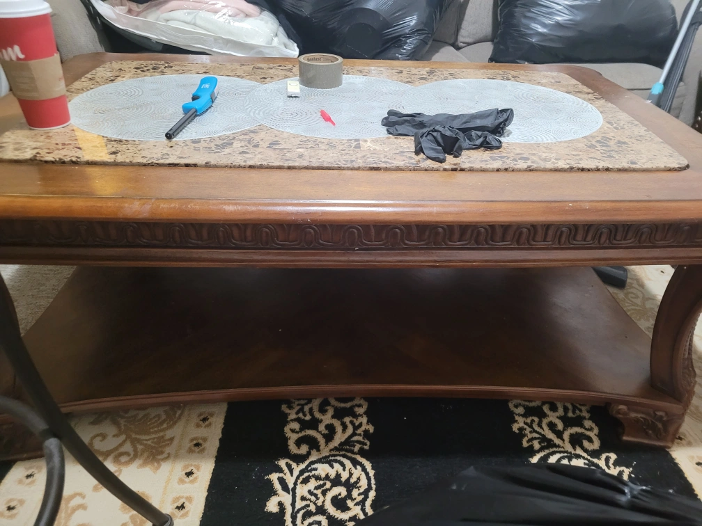 Coffee table with a wood finish. Has a lower shelf for extra storage. Used, and has very minor scratches. The table is extremely heavy as the middle is marble.