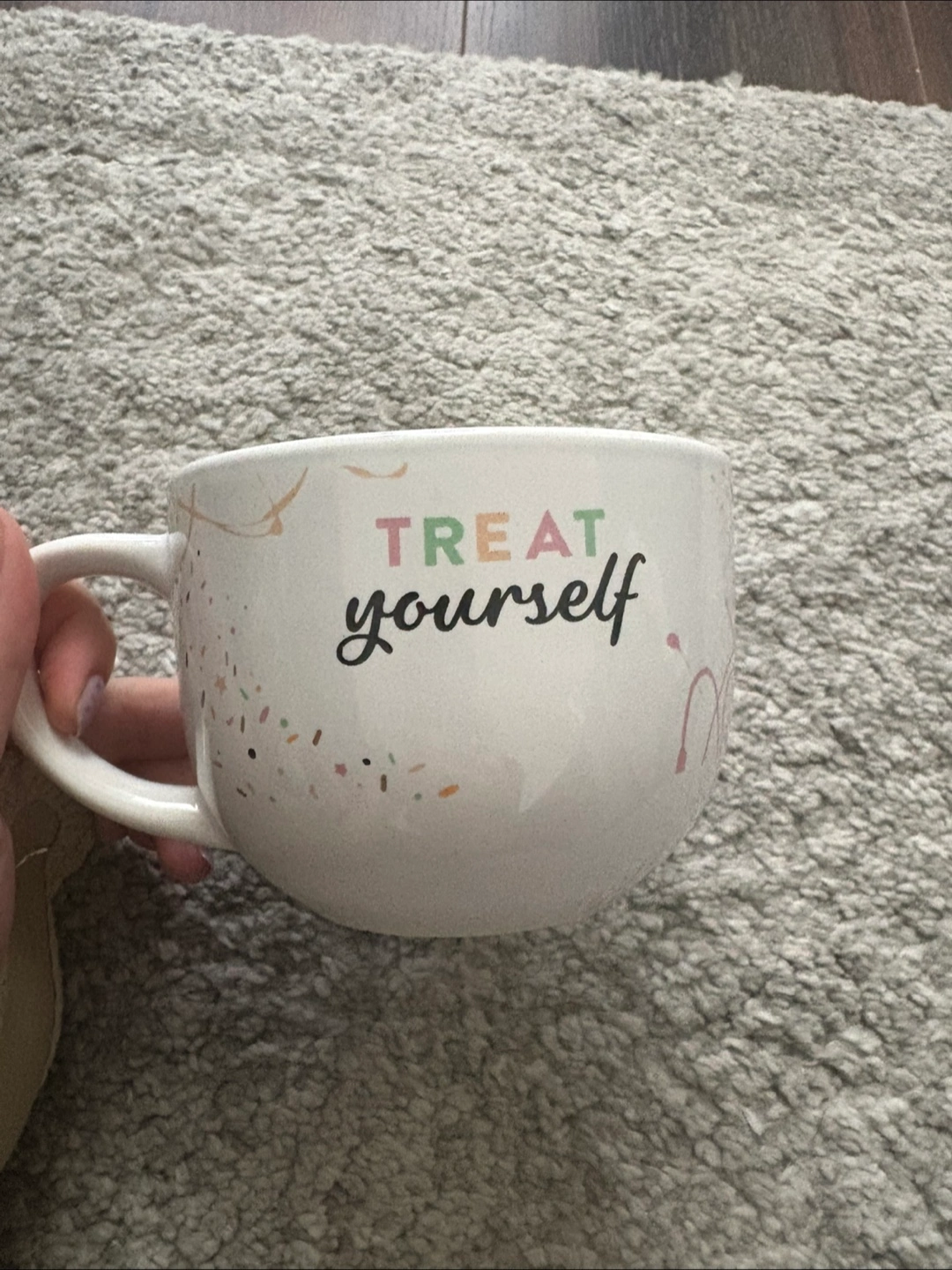A cute 'Treat Yourself' mug for your morning coffee or tea! It's white and in great condition. Microwave and dishwasher safe