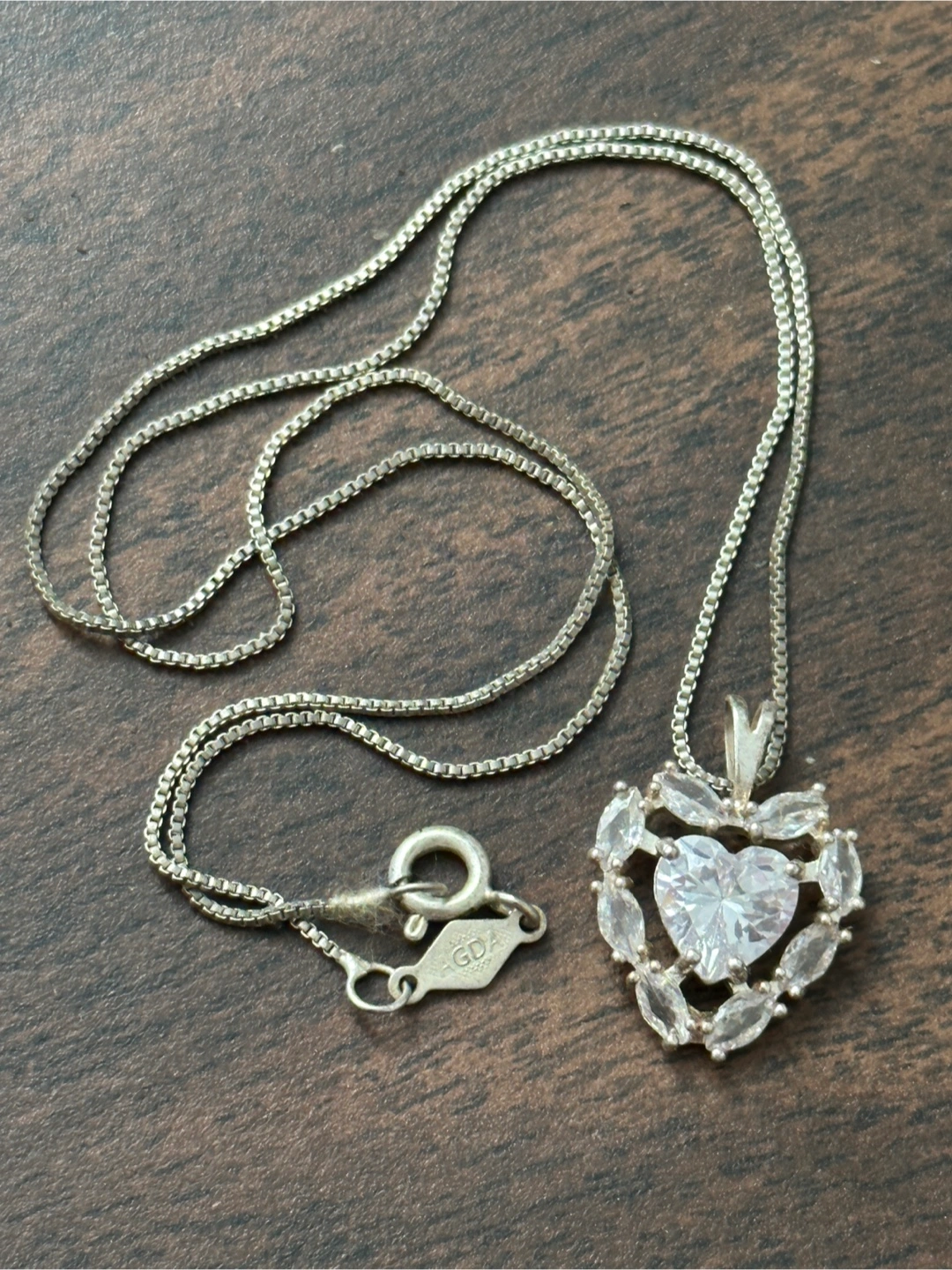 Selling a lovely heart pendant necklace. It has a beautiful heart-shaped stone surrounded by smaller stones, all on a delicate chain. Not from shein/aliexpress so it doesn’t tarnish easily