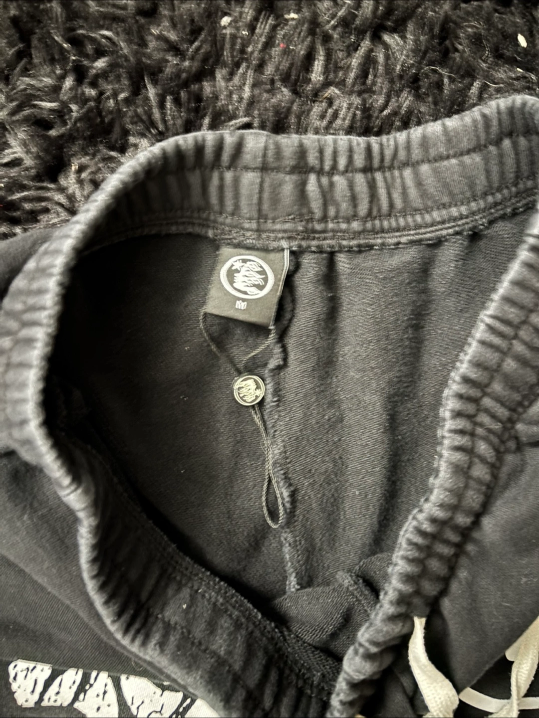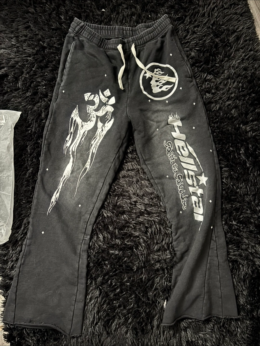 Selling a pair of Hellstar sweatpants. They are in great condition and size medium. The pants feature unique graphics and a comfortable fit. Perfect for casual wear!