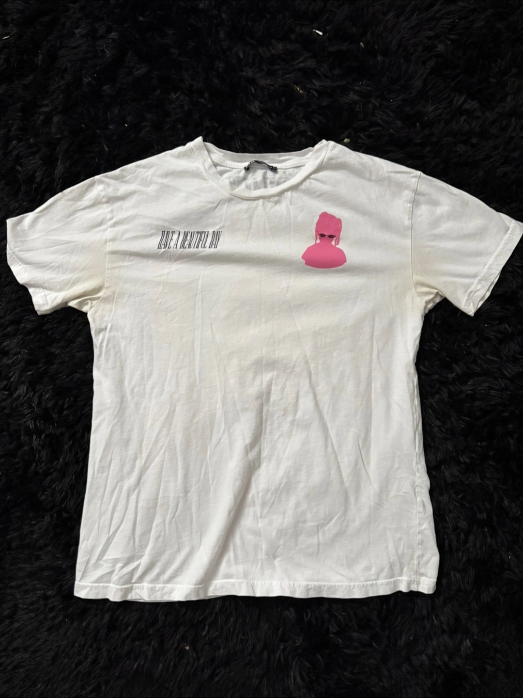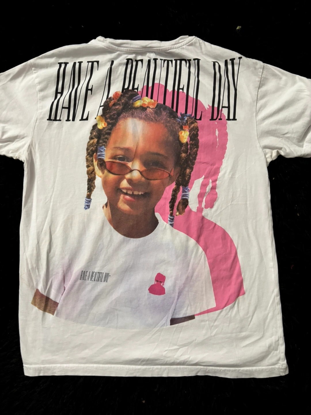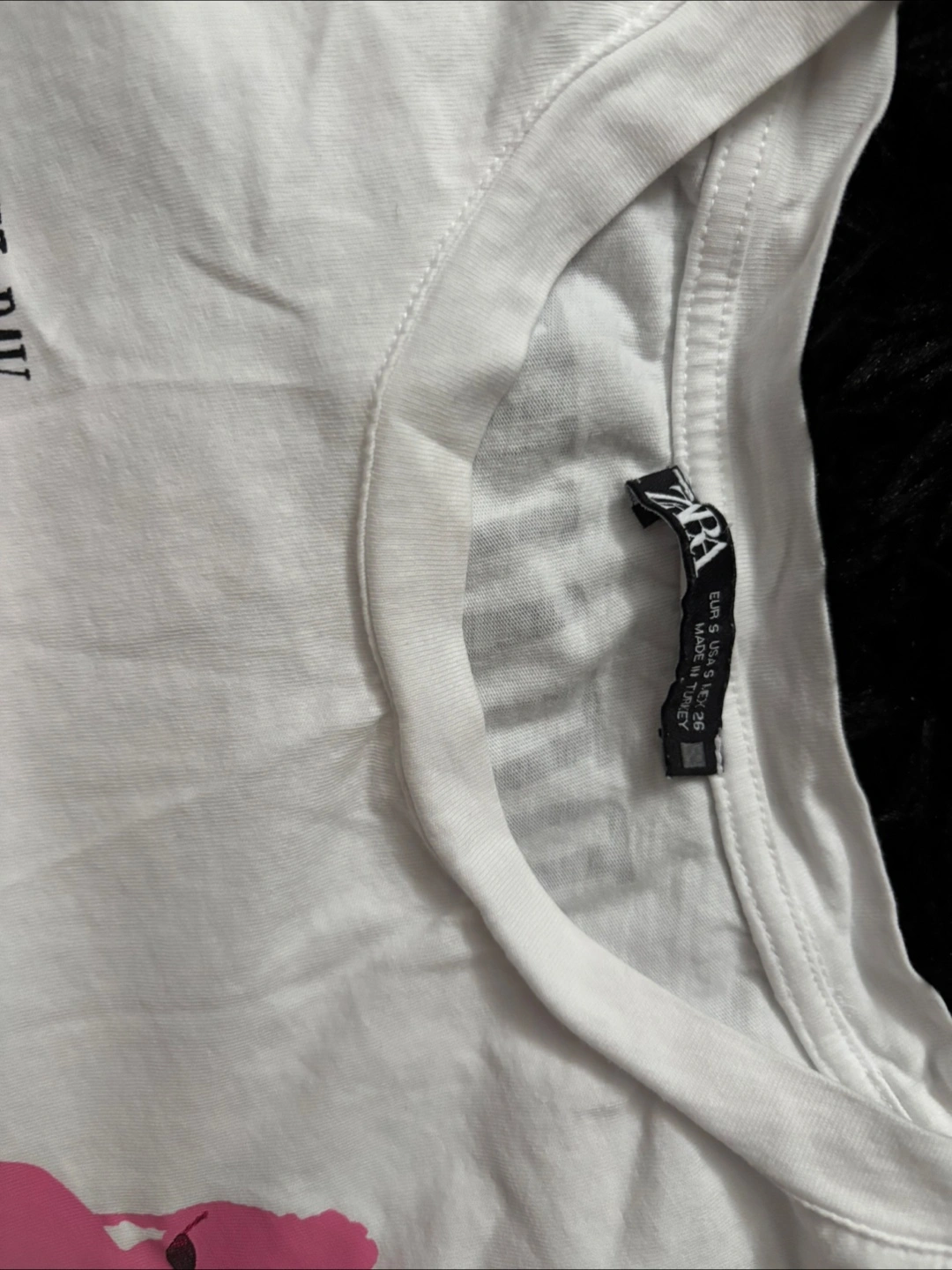 Selling a Zara T-shirt with a unique 'Have a Beautiful Day' design! The shirt is white and size small. It features a graphic print on both the front and back. Perfect for casual wear!