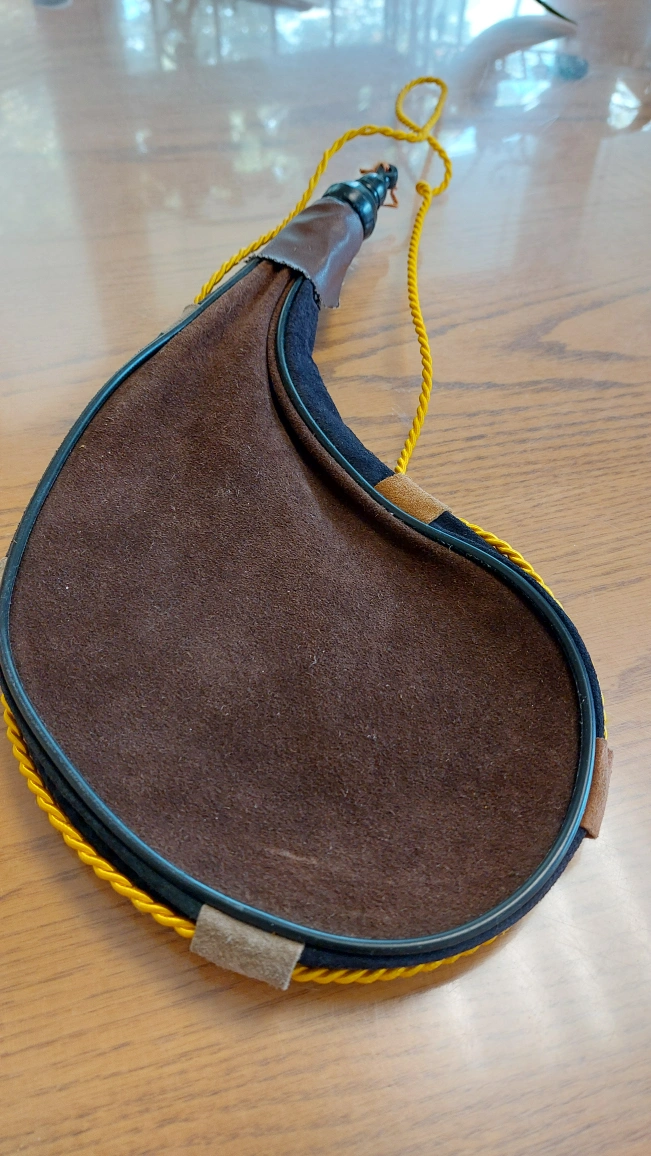 Vintage water "bottle ". Brown suede with black, hard plastic piping on both sides for durability. Has suede loops for the gold cable style carrying strap. Bought as a novelty and never been used. 14" × 6" at it longest length and width.