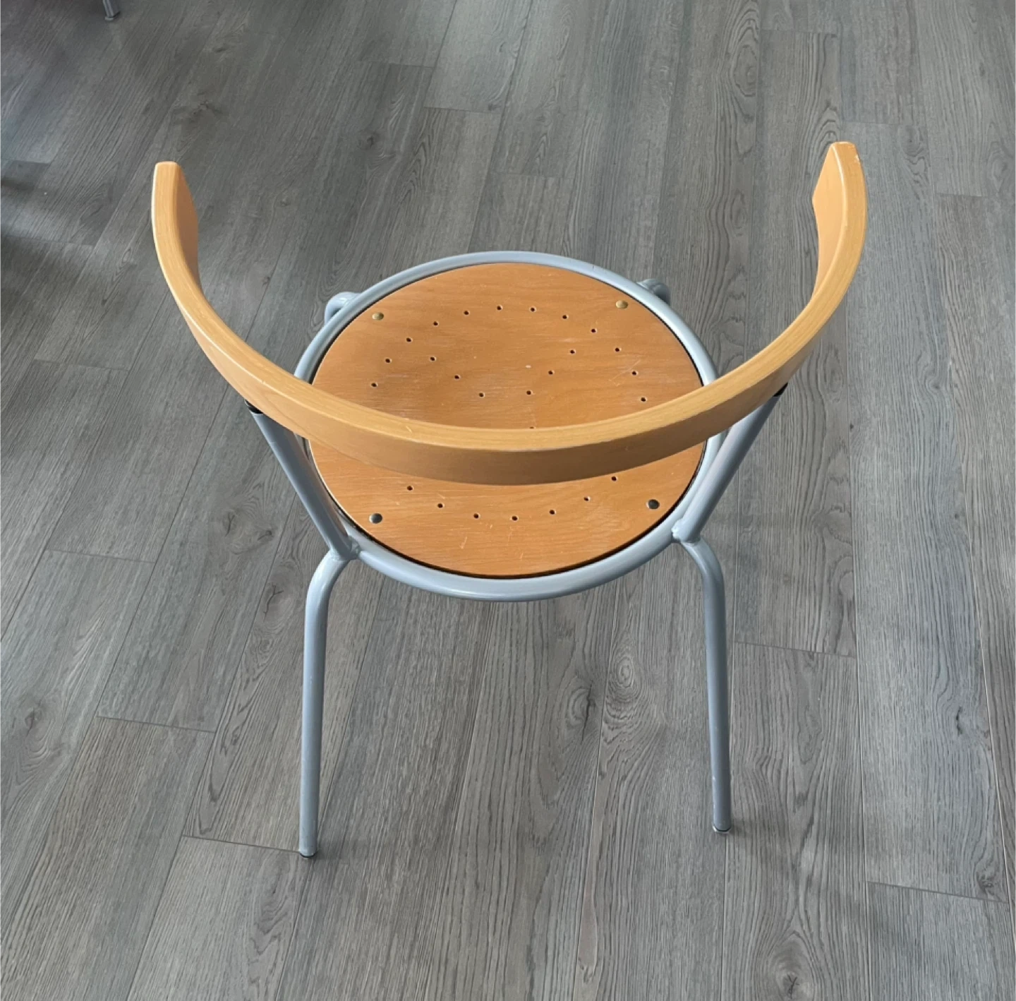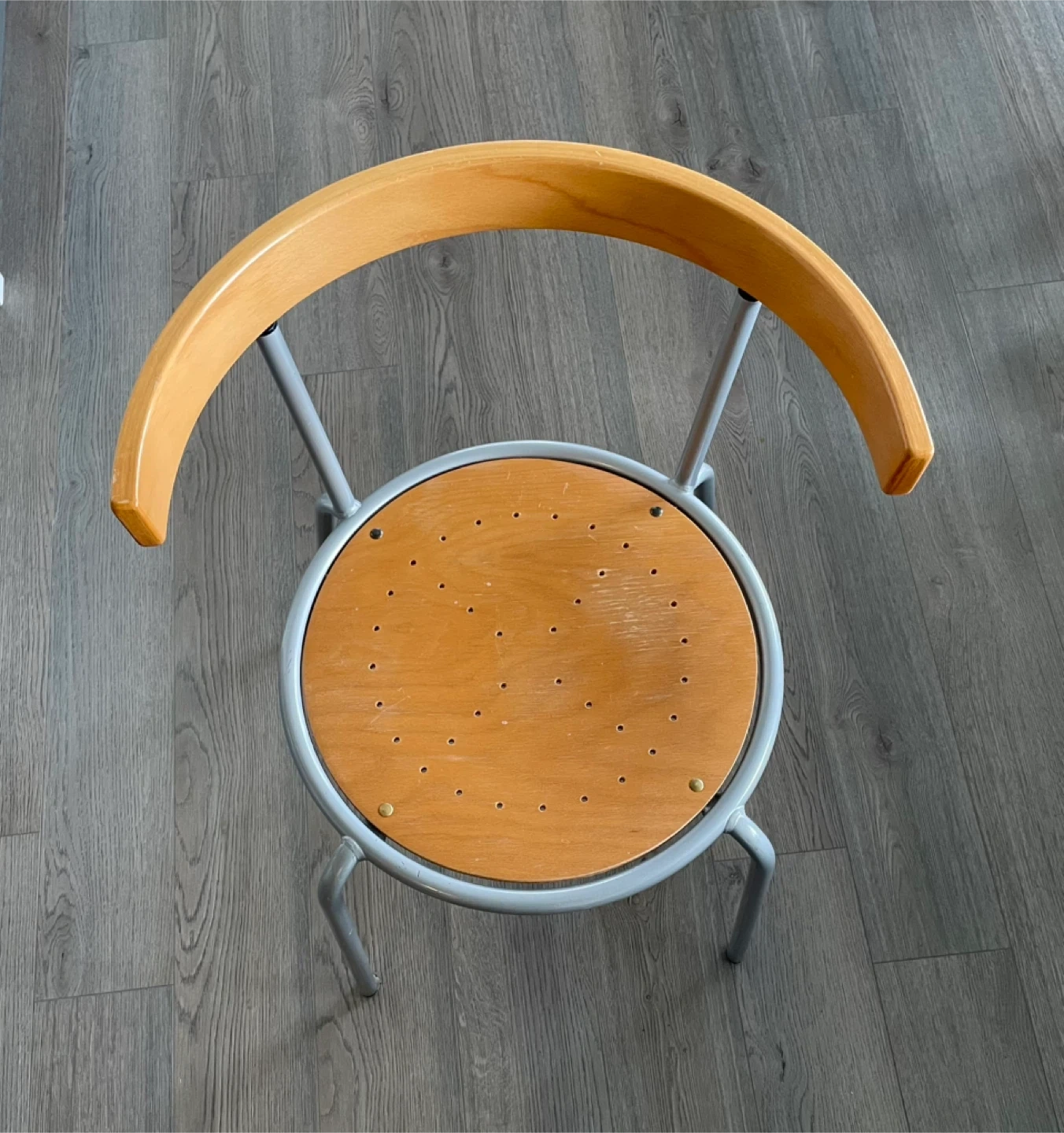 This is a sturdy, well-constructed round chair, perfect for a student or as an extra seat in your home. This chair has a rounded wooden backrest and seat, complemented by a sleek, silver metal frame. As a used item, it shows some signs of wear, (see picture 5) which only add to its vintage appeal!