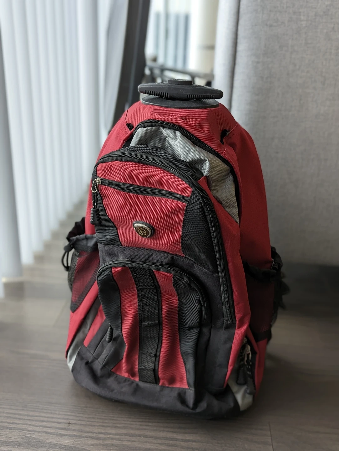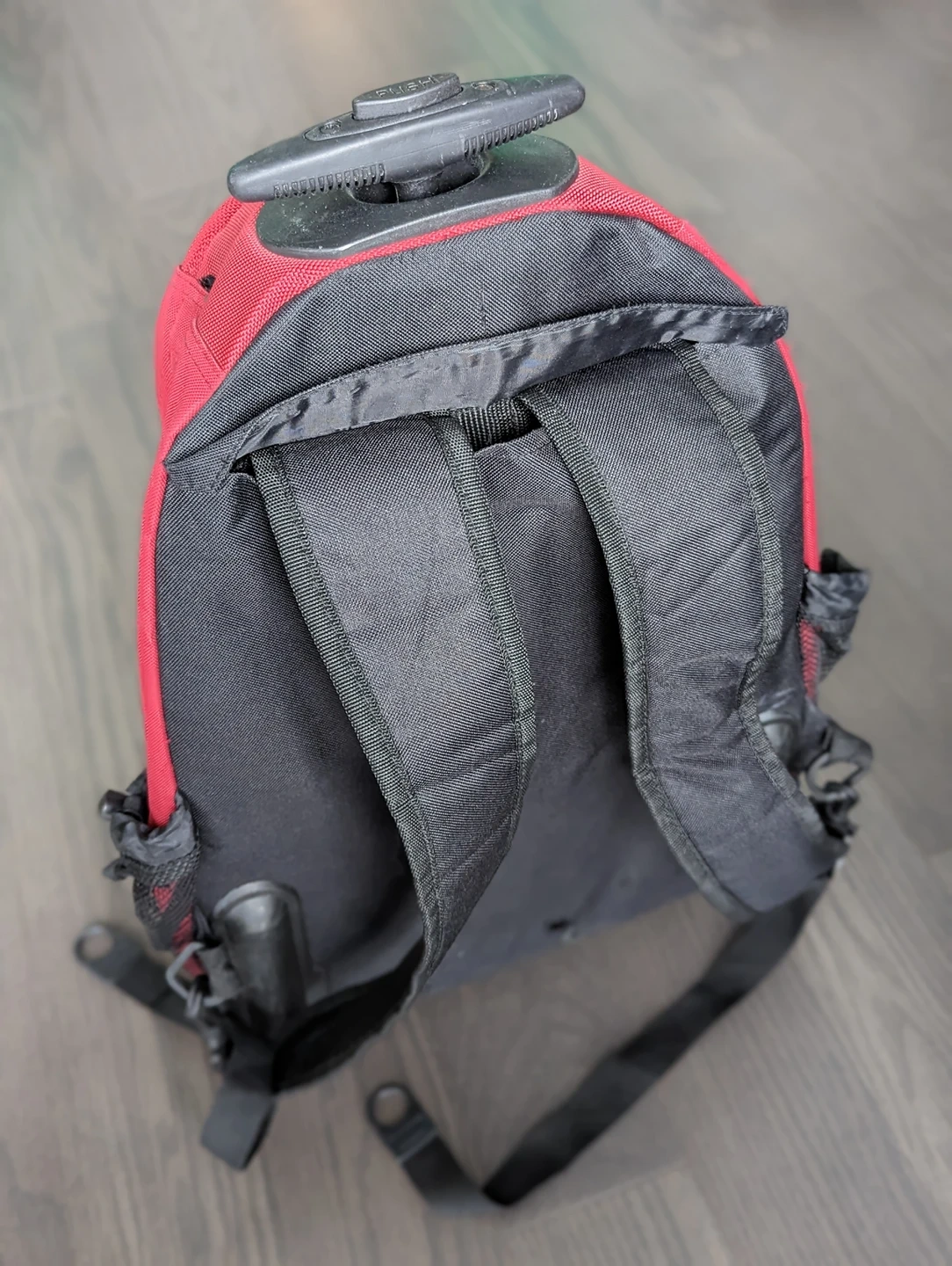 Rolling travel bag with several compartments that converts to a backpack. It's great as a carry-on, and I've used it many times as one. It is missing a cloth handle at the top but in otherwise good condition. It rolls wells, the handle extends smoothly, and the compartments are intact and clean.
