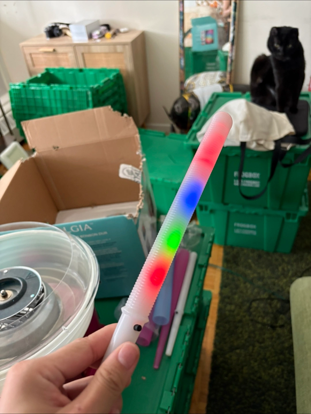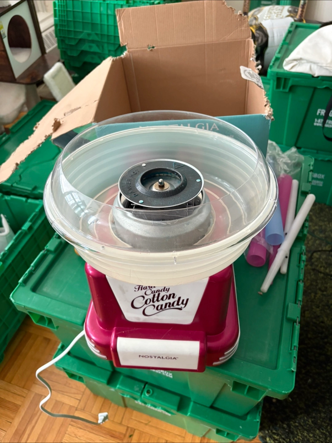 Comes with cotton candy maker, 2 blue cones, 2 pink cones, and 2 light up cones to spin the cotton candy onto!