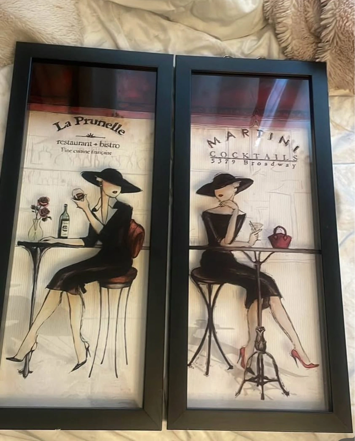 Selling a set of two framed prints. One print features "La Prunelle restaurant + bistro Fine cuisine française" and the other features "MARTINI COCKTAILS 5379 Broadway". They are in great condition and would add a touch of elegance to any room