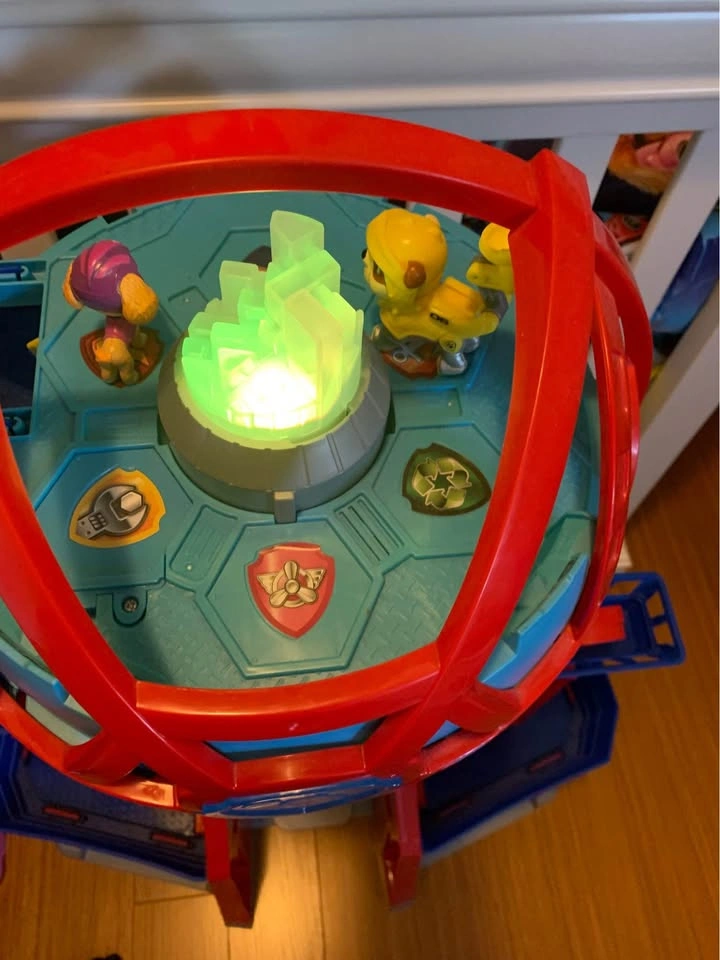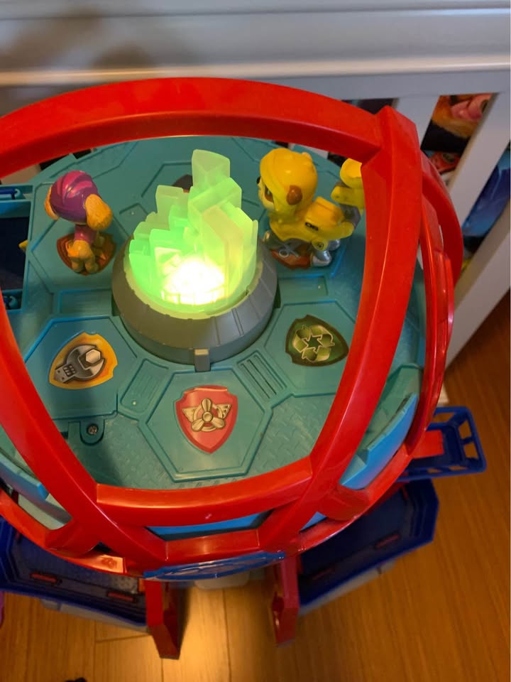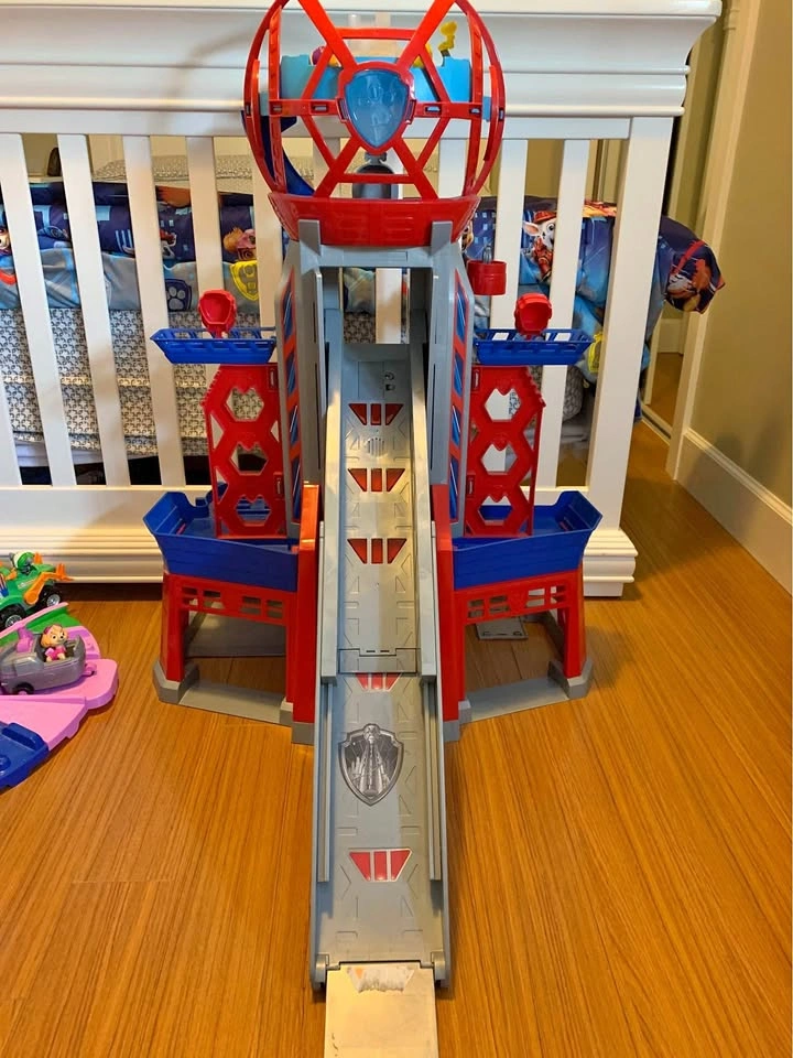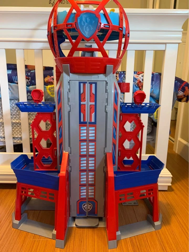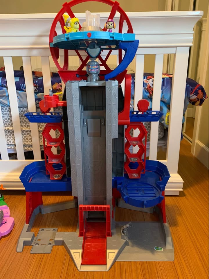 Like new. Makes sounds and phrases. Larger tower. Slides moves in and out for car launching. Includes rubble and sky pups as shown