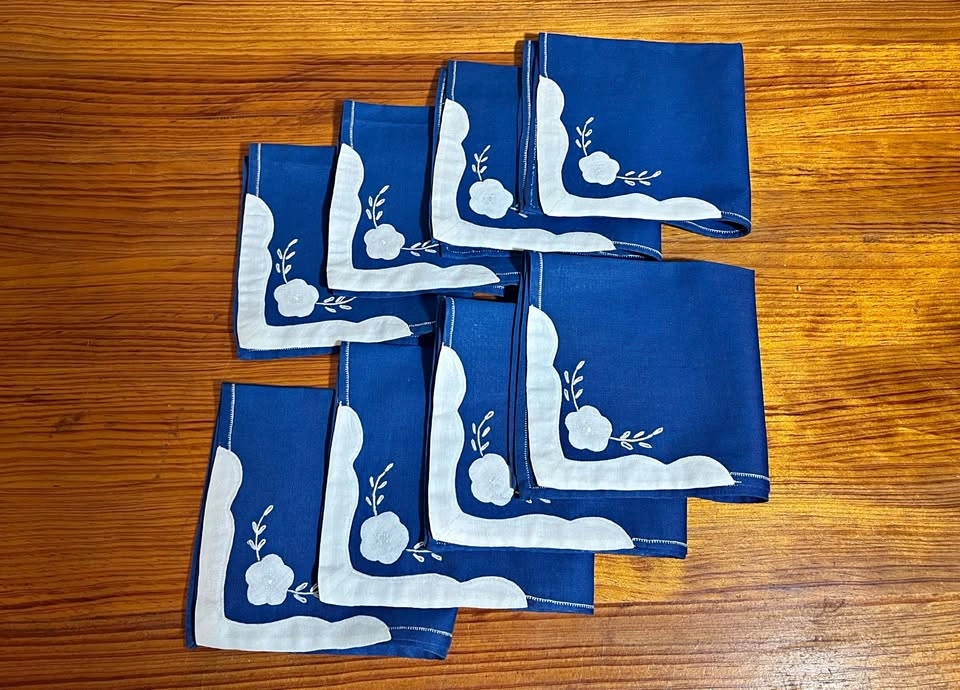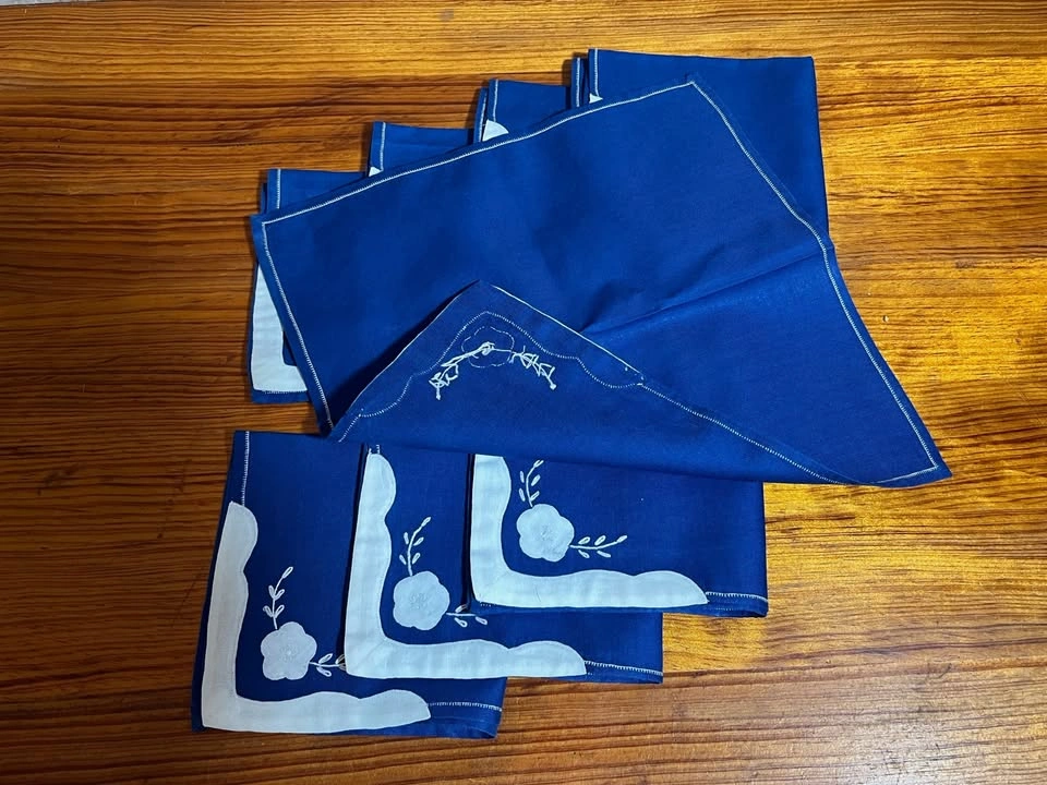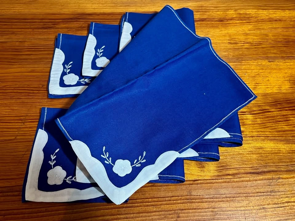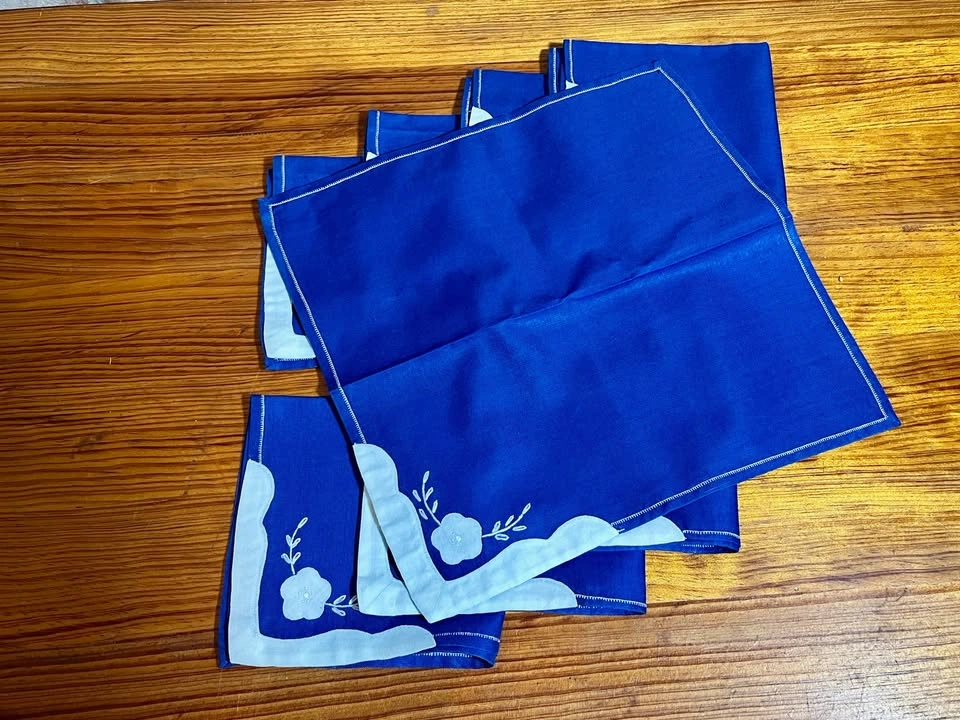 Blue square cotton napkins with stitched white flower appliqué in corner and white border. Each napkin measures approximately 10 inches squared (due to handmade nature, each napkin is slightly unique). Purchased in the late 1970s. They have been in storage since, and have never been used.