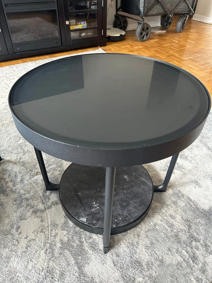 97Selling because I'm moving and don’t have space for tables. Like new, no scratches or damage to glass, frame, or wooden base. Coffee table dimensions: Width: 37" Height: 2.25" Length: 37" Weight: 55 lb 11 oz Side table dimensions: Width: 19.5" Height: 2.25" Length: 24.5" Weight: 22 lb 11 oz Coffee table: $130 Side table: $50