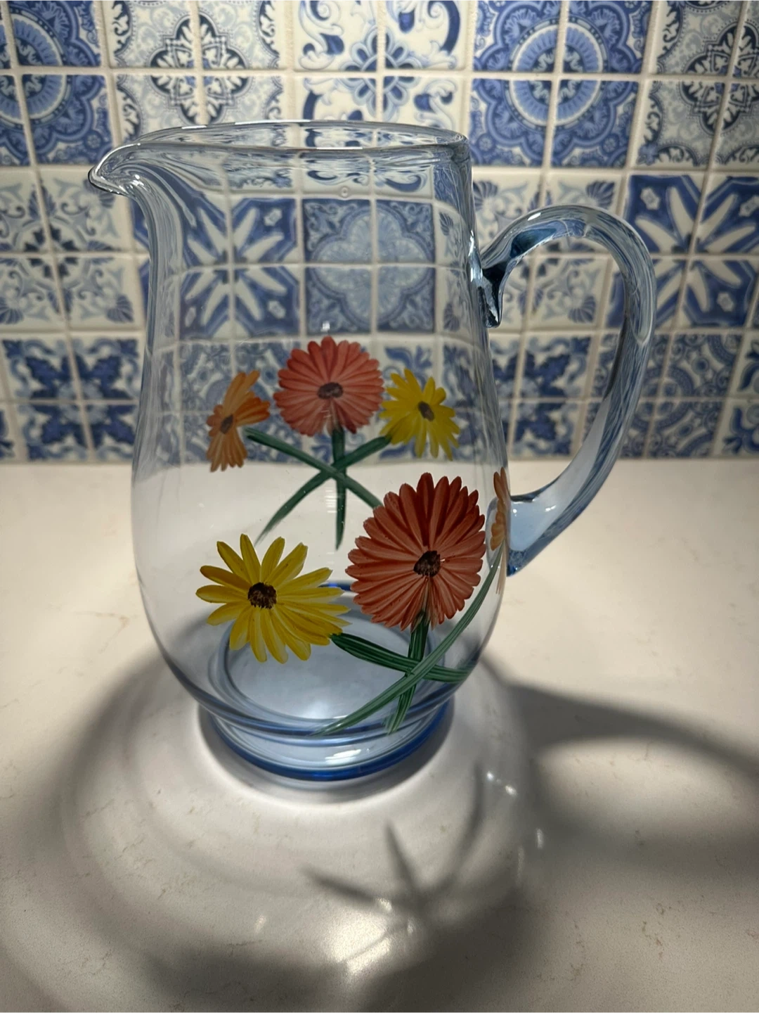 Cheerful glass pitcher features a fun floral design. Blue tinted glass. Perfect for serving cold beverages on a hot summer day or can be used as a vase. Cash payment. Pick-Up in Pickering (Brock & 401).