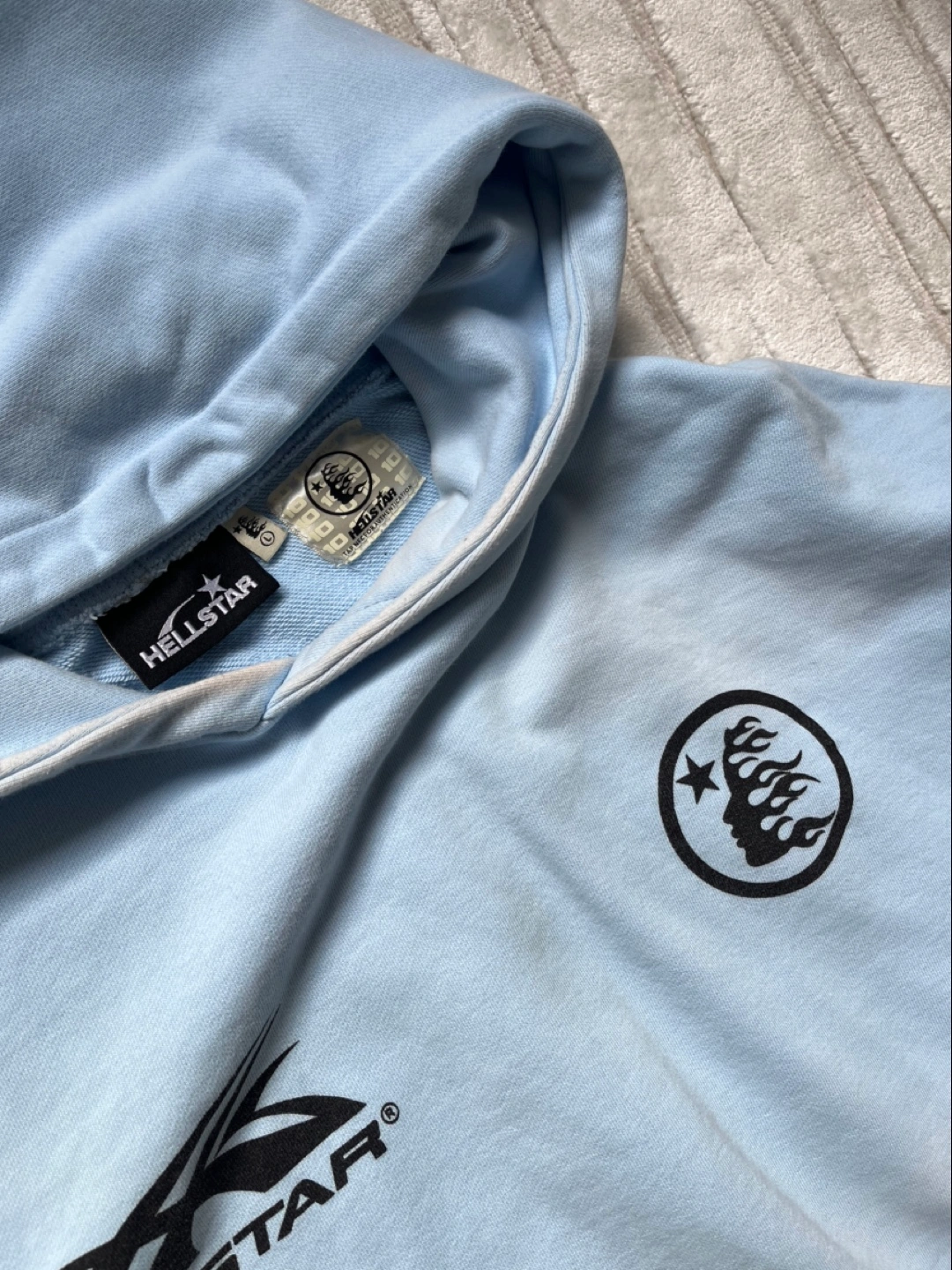 Selling a light blue Hellstar hoodie. It has a unique design with black graphics on the sleeves and chest. There are some signs of wear, as shown in the pictures, but it's still in good condition for everyday wear