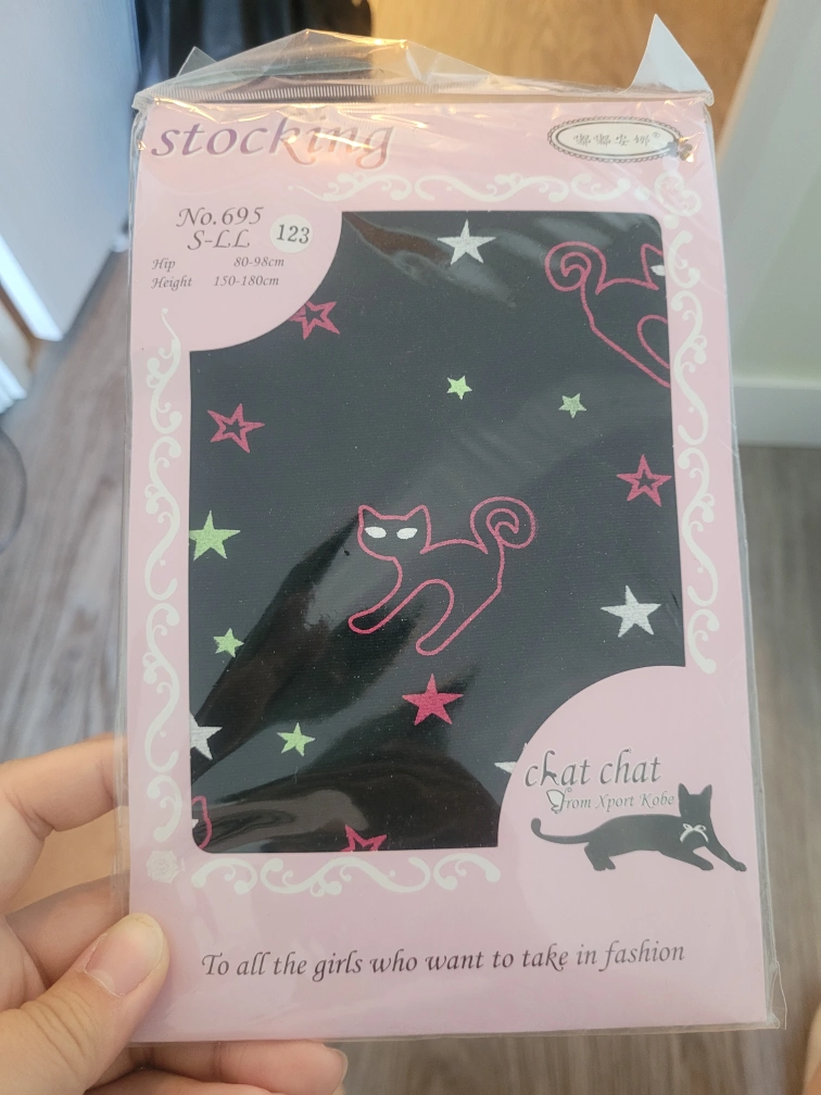 Cute Chat Chat tattoo pantyhose in size S! The material is 20% spandex and 80% nylon. It features a fun design with cats and stars. Perfect for adding a touch of whimsy to your outfit!