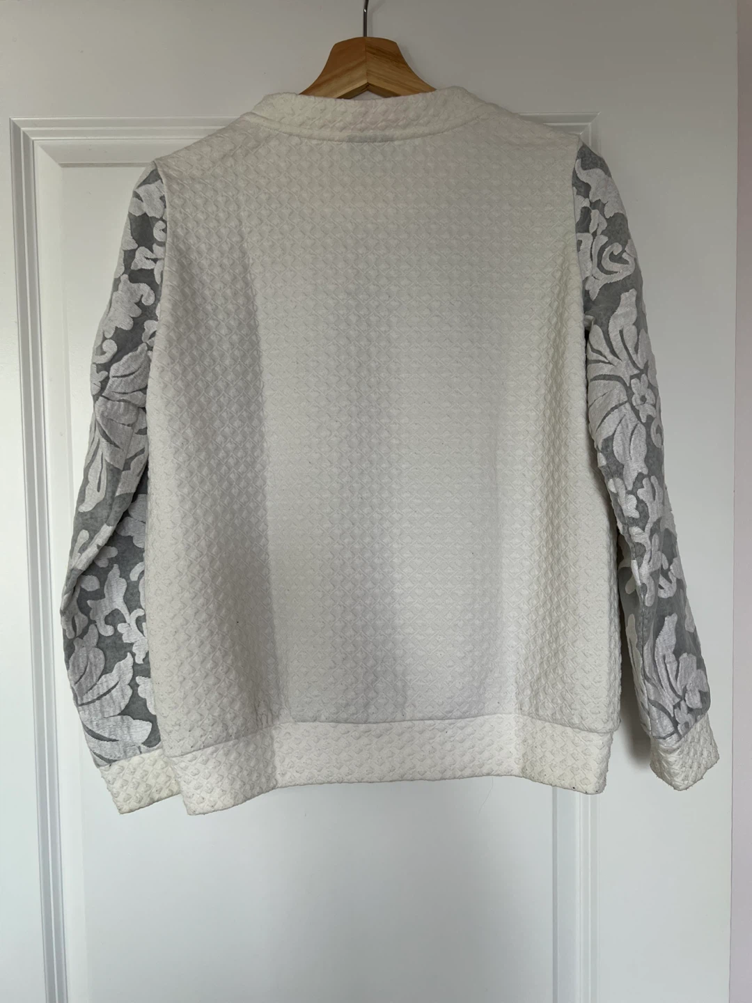 Selling a stylish sweater featuring unique floral sleeves. The body of the sweater has a textured pattern. It's in great condition and ready for a new home!