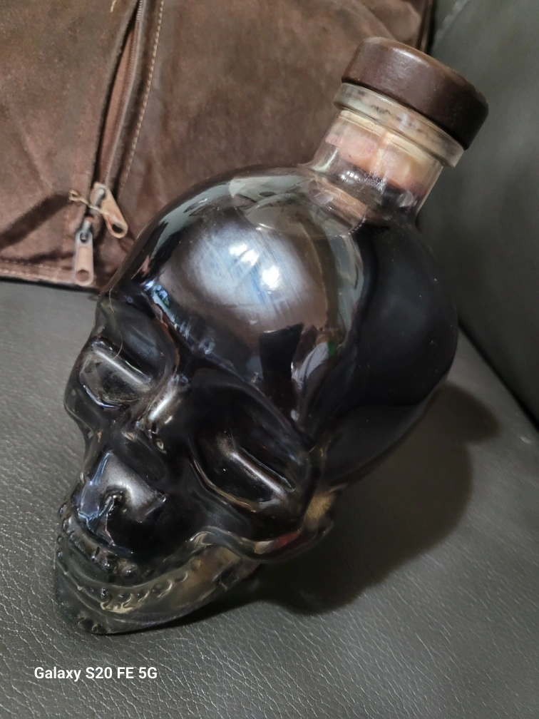 Unique skull-shaped glass bottle, perfect for decoration or storage. It has a wooden stopper. Great for adding a touch of gothic flair to your space!