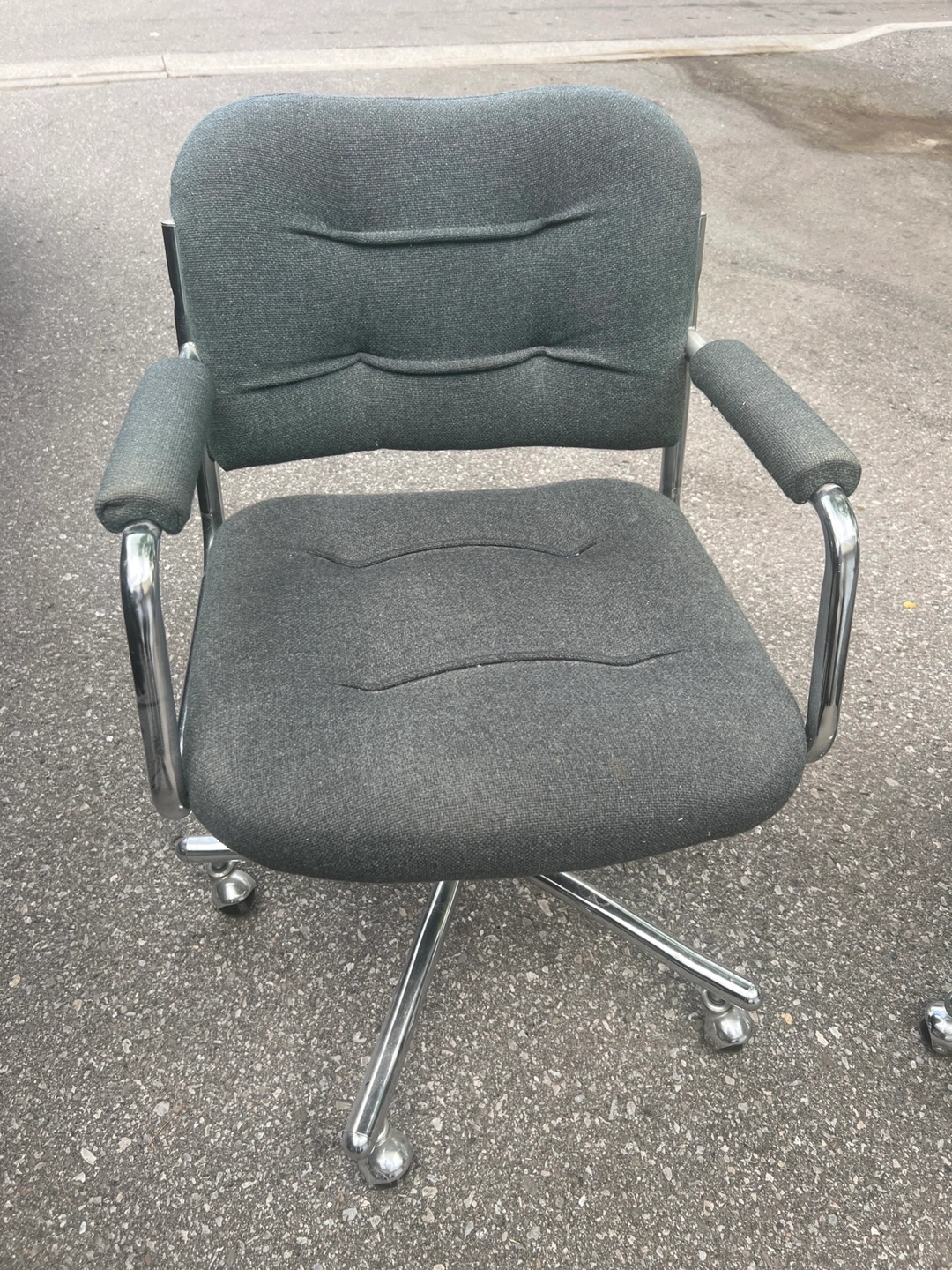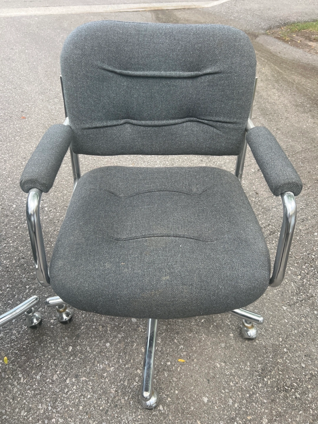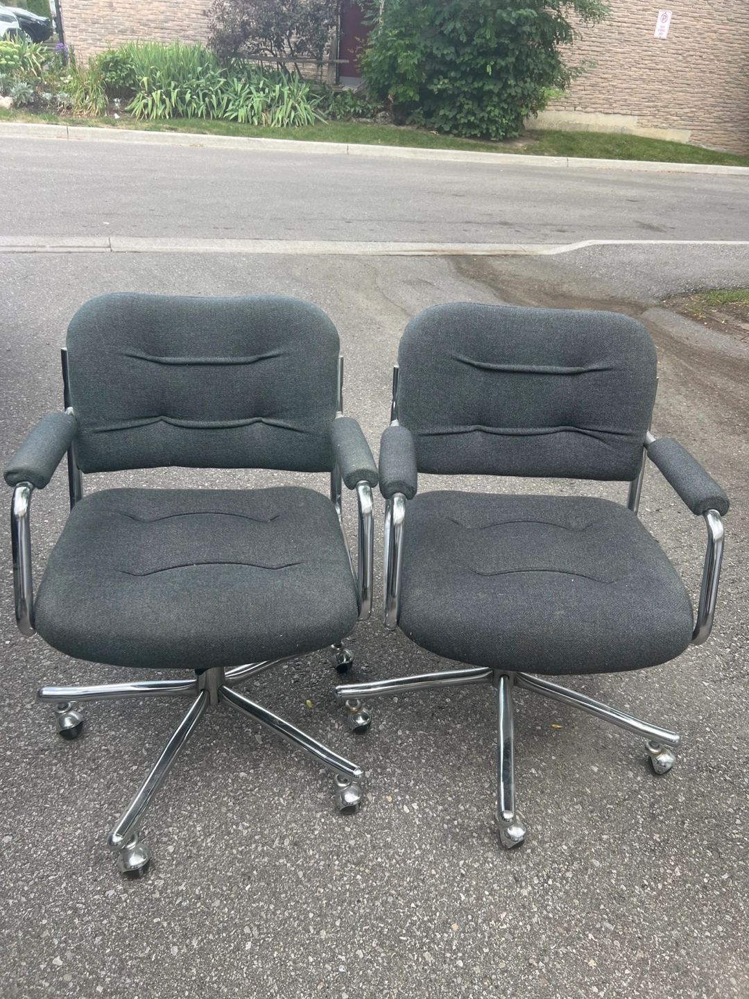 Selling a pair of grey office chairs! They're in good condition and ready for a new home office setup. The chairs have a comfortable design with armrests and a rolling base, perfect for long work sessions