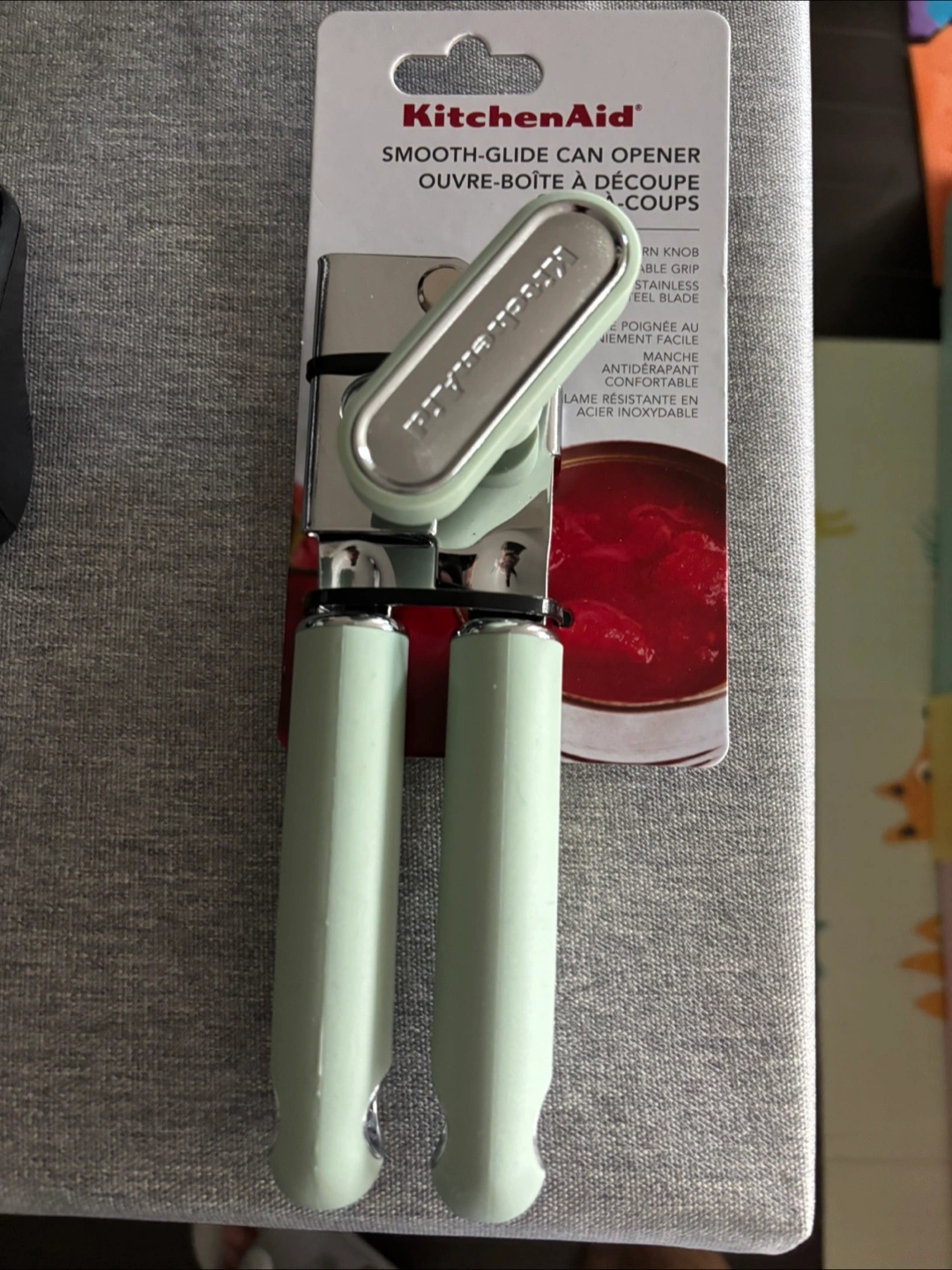 I'm selling a KitchenAid Smooth-Glide Can Opener in the lovely pistachio colour! It's brand new and ready to make opening cans a breeze in your kitchen! This can opener features an ergonomic handle for a comfortable grip and a durable steel blade for smooth and efficient cutting