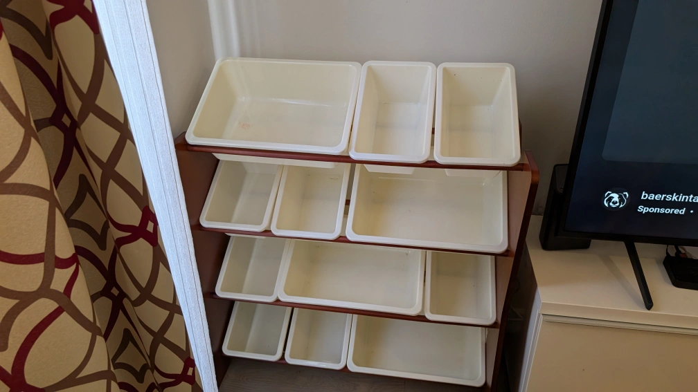Selling a kids toy storage organizer! It features a sturdy wooden frame and several removable bins, perfect for keeping toys organized and easily accessible. It's in great shape and ready for a new home