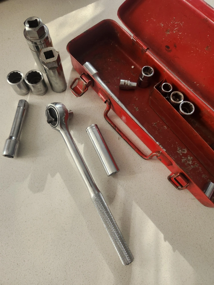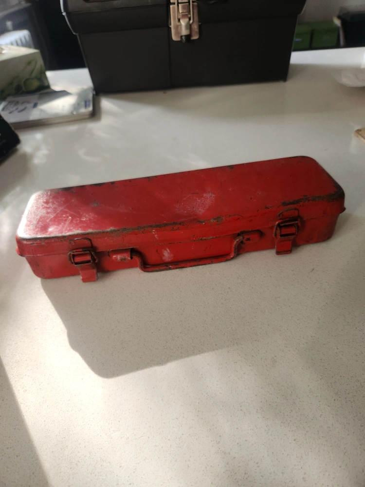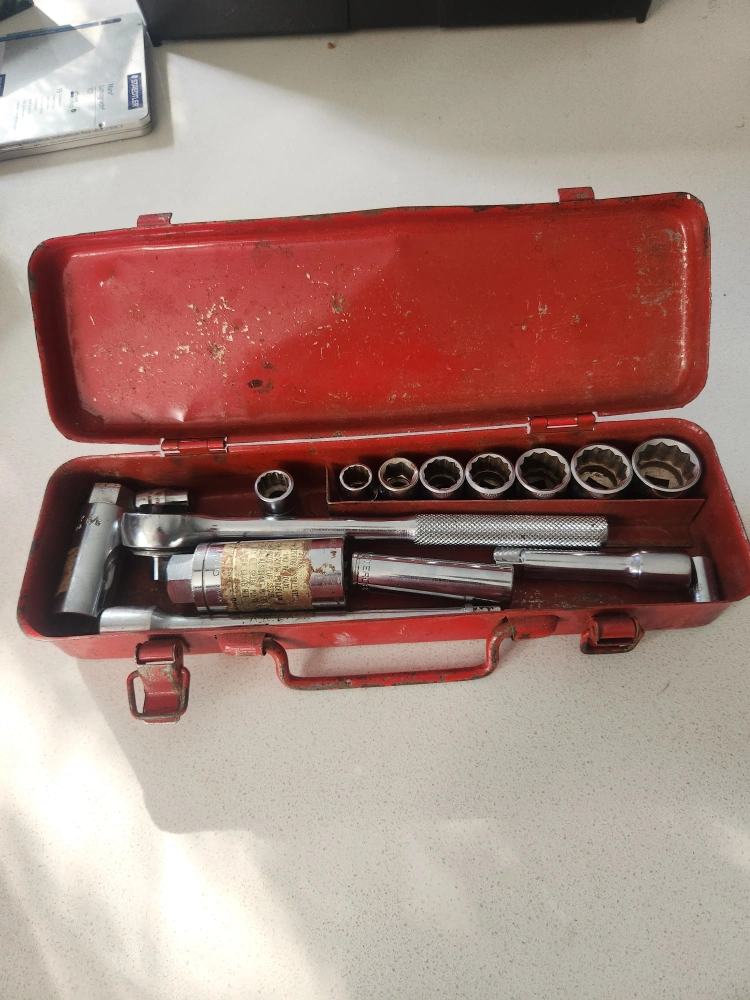 Vintage ratchet set in a red metal case, dating from the 1970s–80s. The set is complete, works like new, and includes a couple of extra sockets from Gray Canada and Mastercraft. All components are etched with “Japan” and show minimal wear from careful use. No manufacturer’s mark is present, but the set is in excellent condition, fully functional, and also a great addition for collectors or anyone who appreciates quality vintage tools.