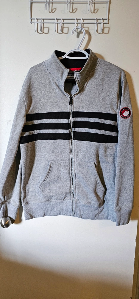 Canada Weather Gear full zip jacket in size L. It's grey with black stripes and the Canada Weather Gear logo on the sleeve. Perfect for Fall or Winter layering! Lightly Used but no defects or tears. Dry Cleaned and Ready to Use. Check my profile for other items up for sale