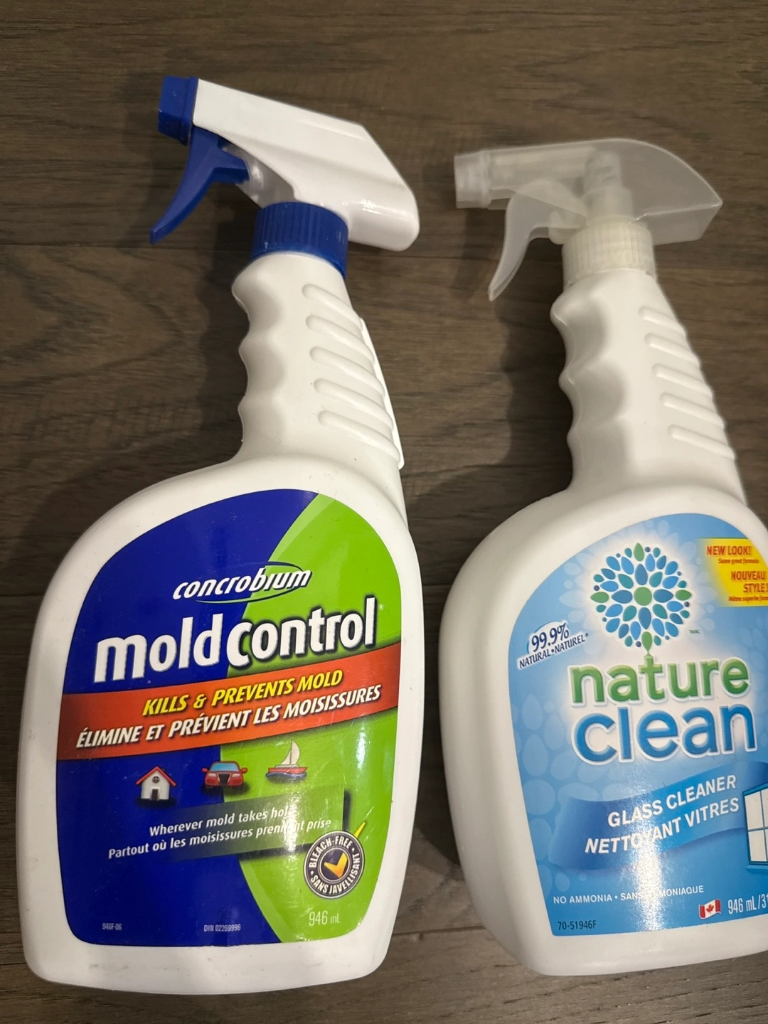 Giving away two bottles of cleaning solution: one Concrobium Mold Control and one Nature Clean Glass Cleaner. Each has about 1/3 left. Pick up today.