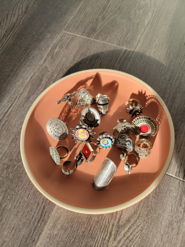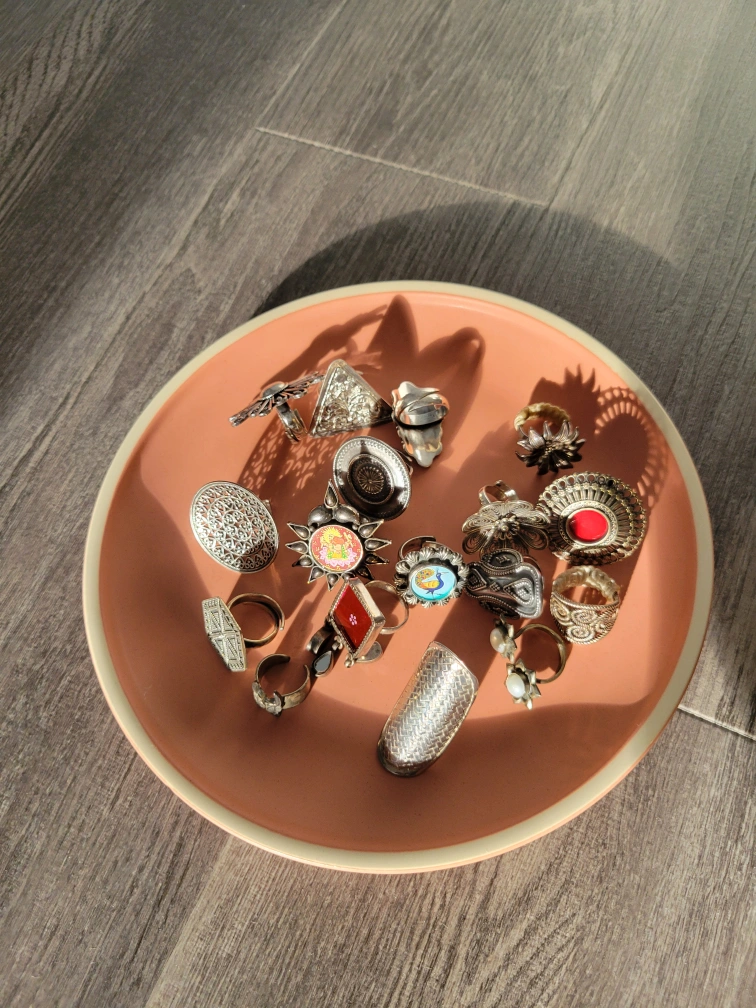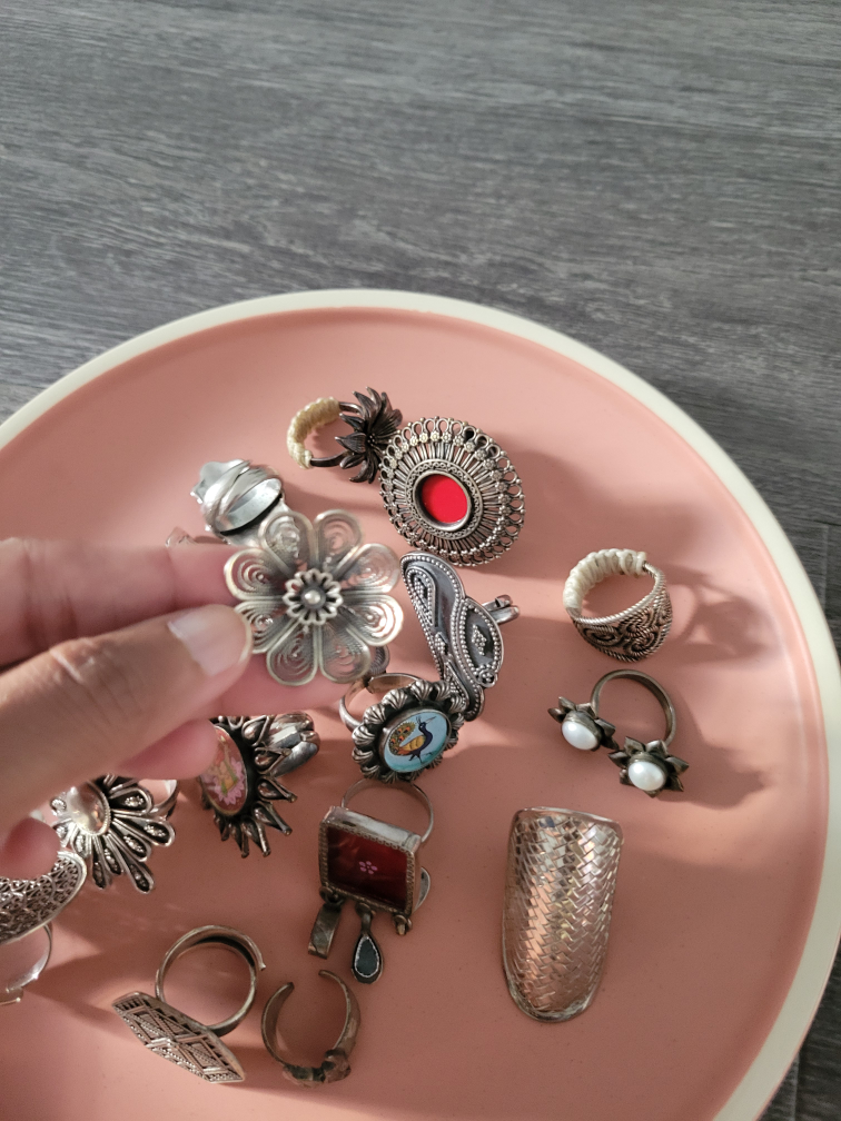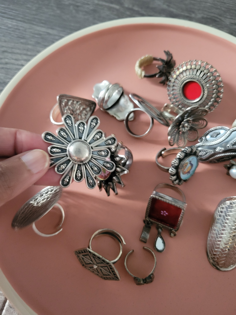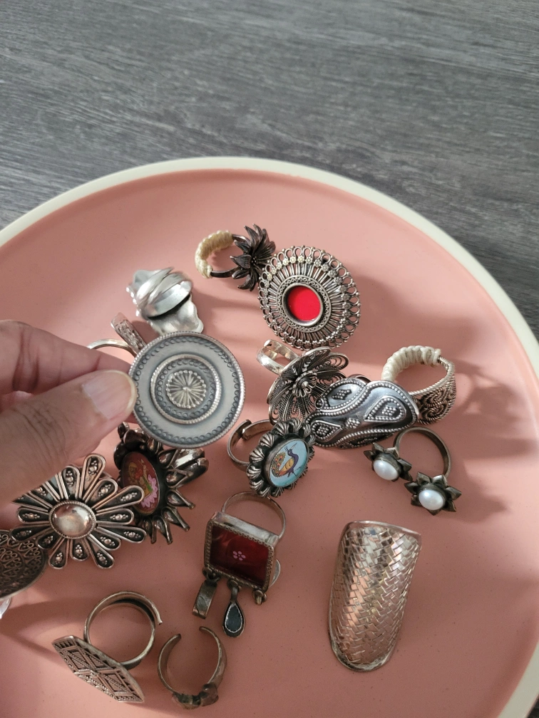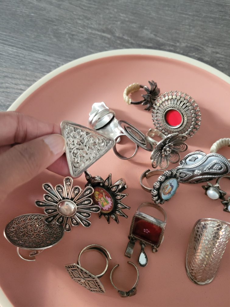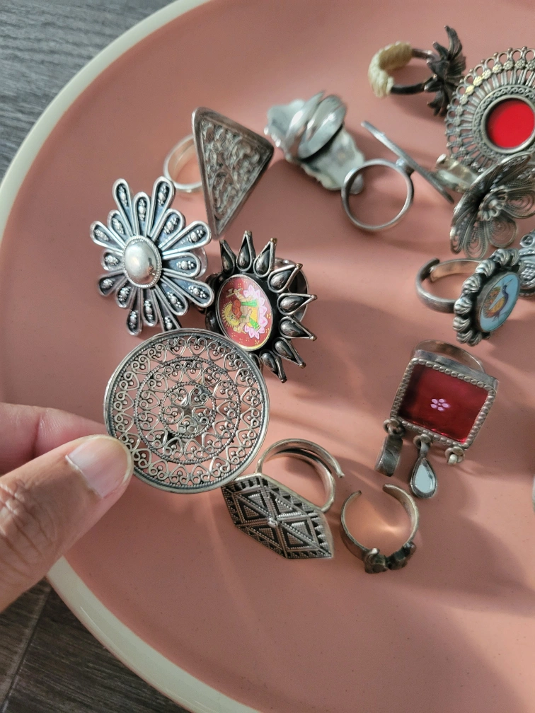 A collection of assorted vintage silver rings with unique designs. Perfect for adding a touch of bohemian style to your look. Each ring has its own distinct character and charm!
