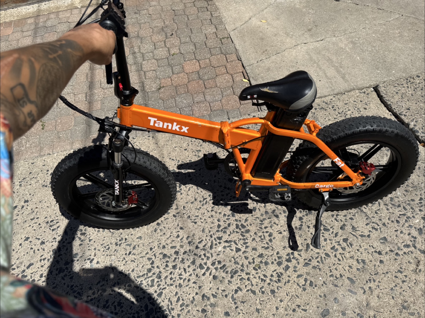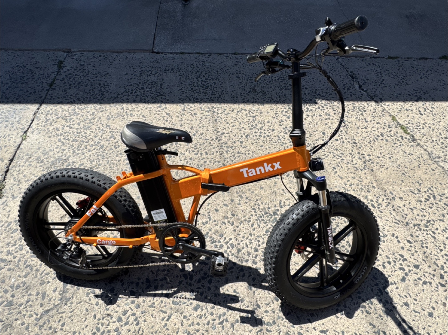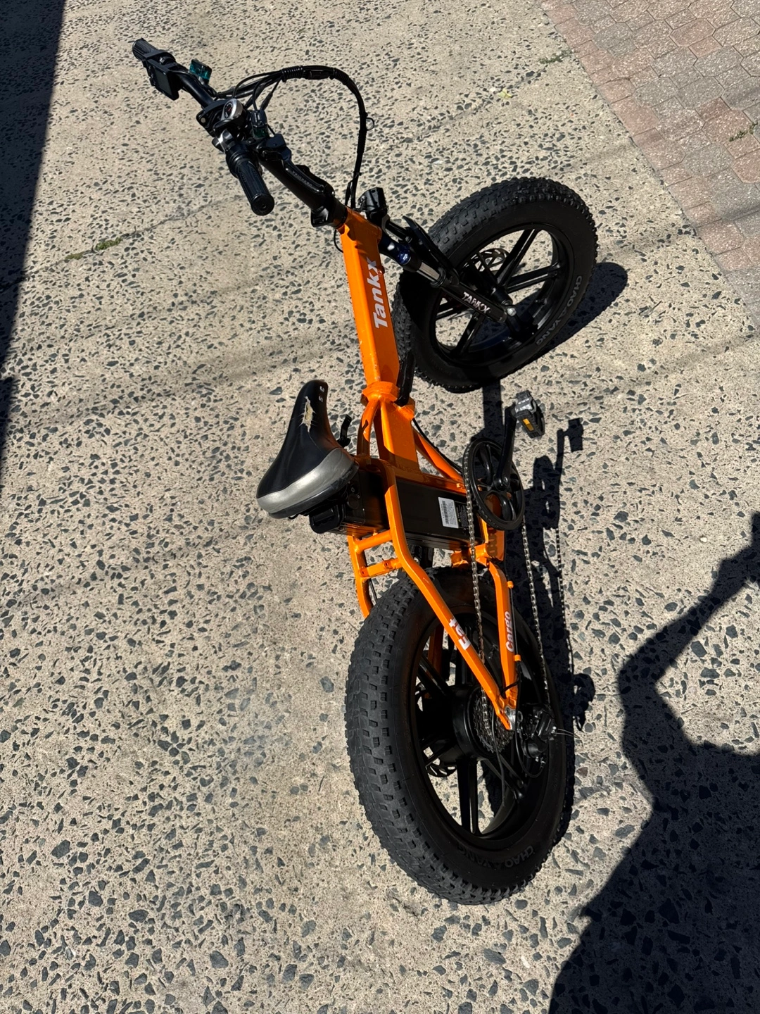 Selling a Tankx Cargo folding ebike in orange and black. This electric bike has fat tires, making it great for all kinds of terrain. It's a folding bike, so it's easy to store and transport. Perfect for getting around town or exploring trails!