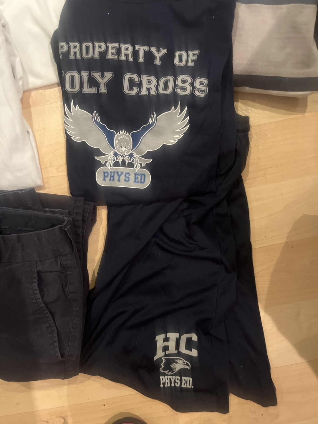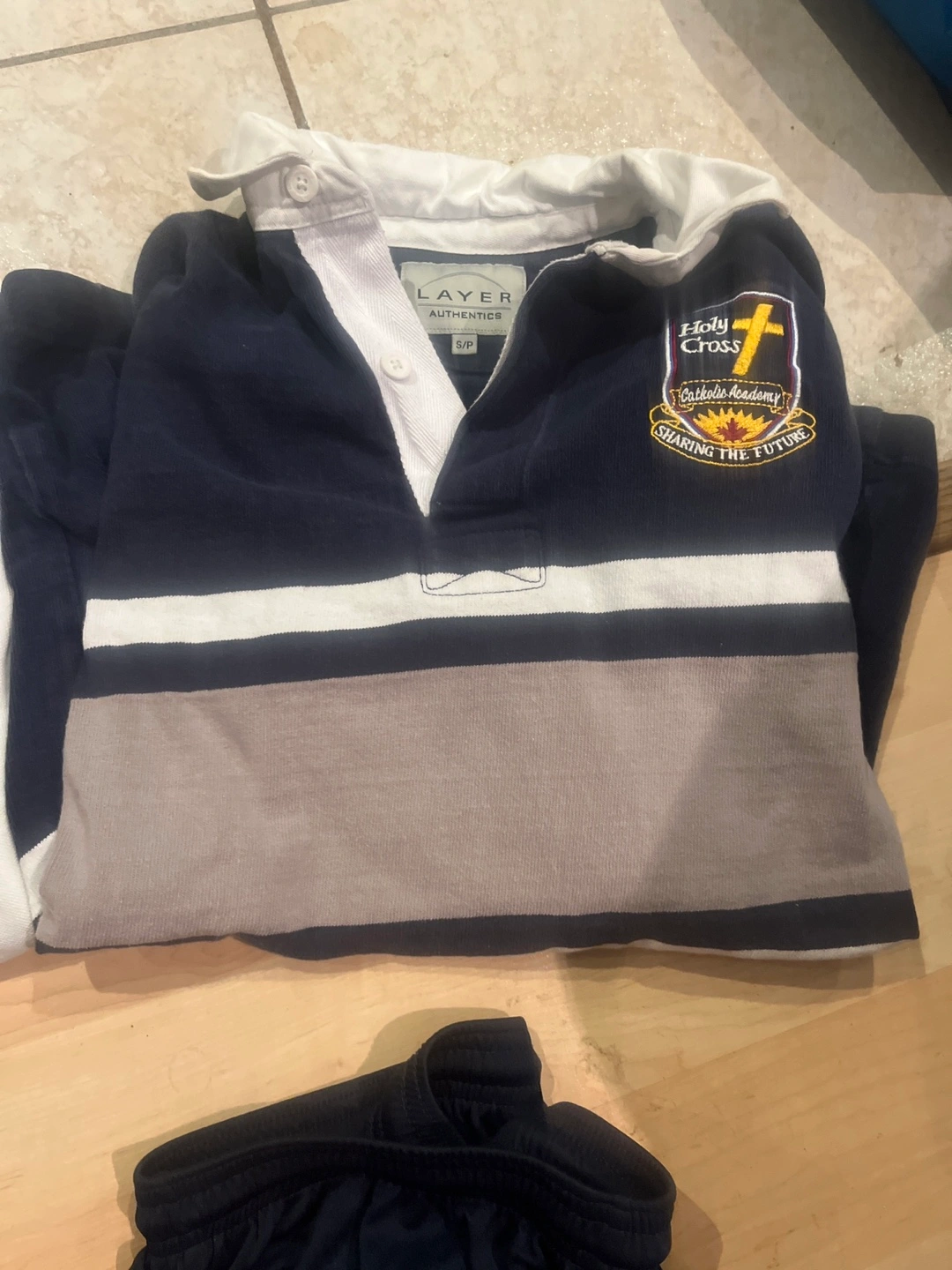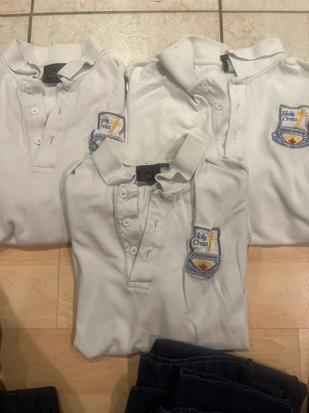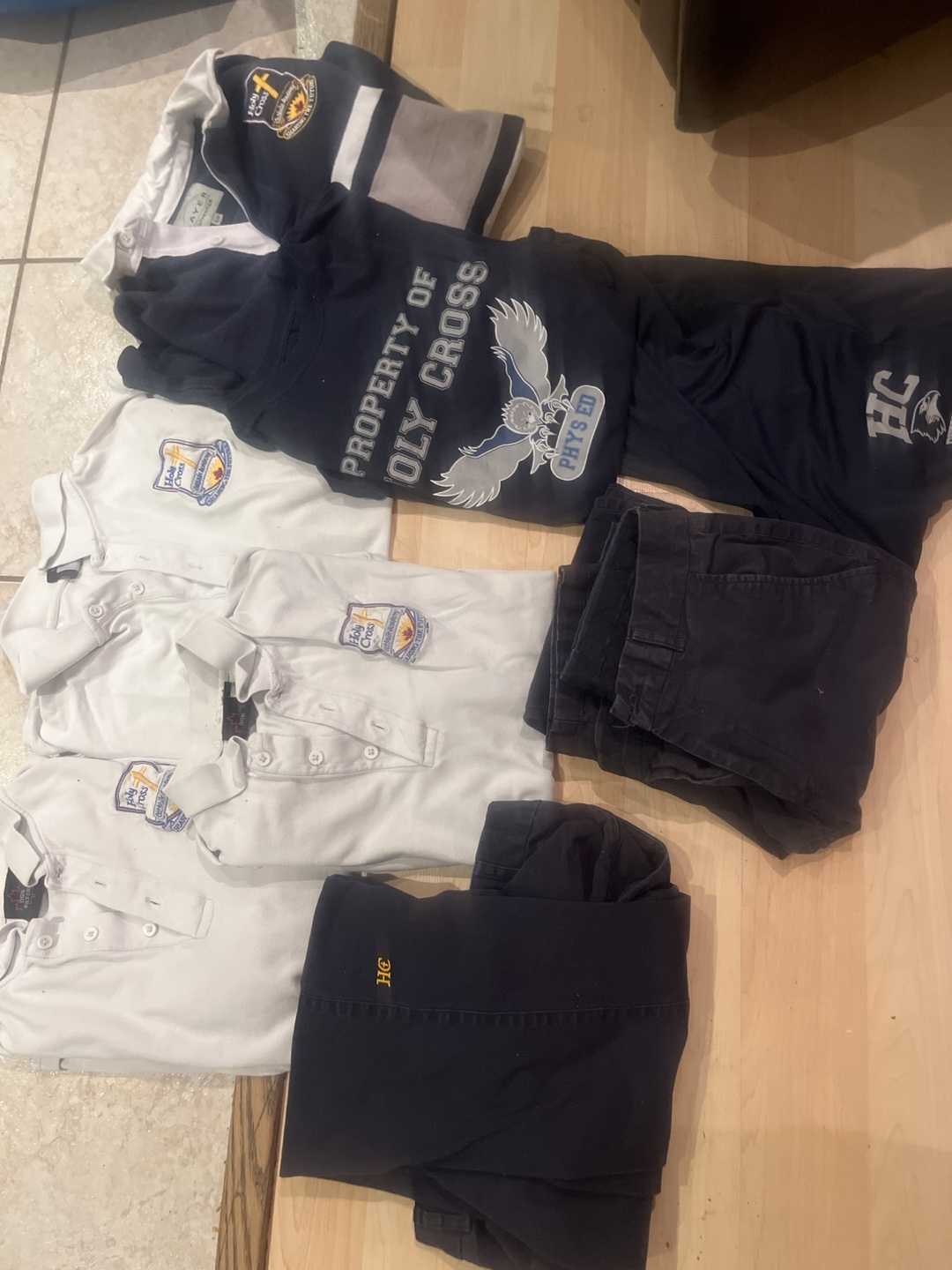 Selling a bundle of Holy Cross school uniform items. Includes polo shirts, rugby shirt, pants, and phys ed gear. All in good condition and ready for a new school year!