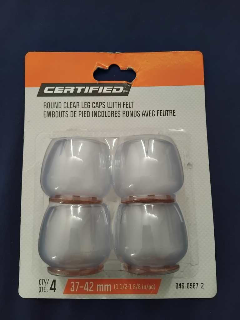 The Certified Round 37-42MM Clear Leg Caps with Felt, 4-pk, bring a touch of finesse to your furniture while protecting floors from damage. Crafted from durable clear PVC with a felt pad underneath, these leg caps glide silently over hard surfaces while shielding them from scuffs and scratches. The round shape matches a variety of furniture styles, from mid-century modern to traditional, and the range of sizes ensures a perfect fit over legs measuring between 37 and 42 mm in diameter. The transparent design keeps the look of your furniture unobstructed while offering functional benefits. Simply snap these plastic leg caps into place and watch as they transform ordinary furnishings into pieces that elevate your aesthetic.