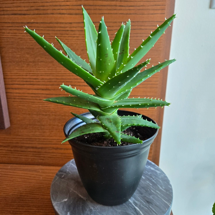 A healthy aloe plant potted in a simple black pot with drainage! It's a great addition to any home and easy to care for. Perfect for adding a touch of greenery to your space! It's also the cute variety that remains compact, perfect for small spaces!
