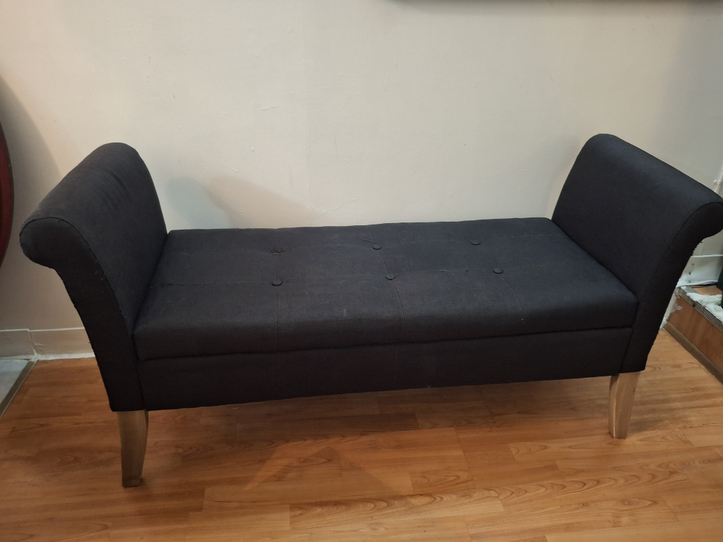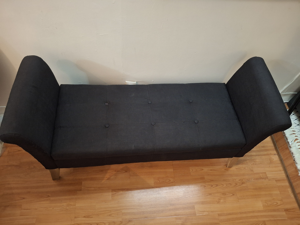 This is a stylish black storage bench. It's perfect for adding extra seating and storage to any room in your home. It's in great shape and ready for a new home!