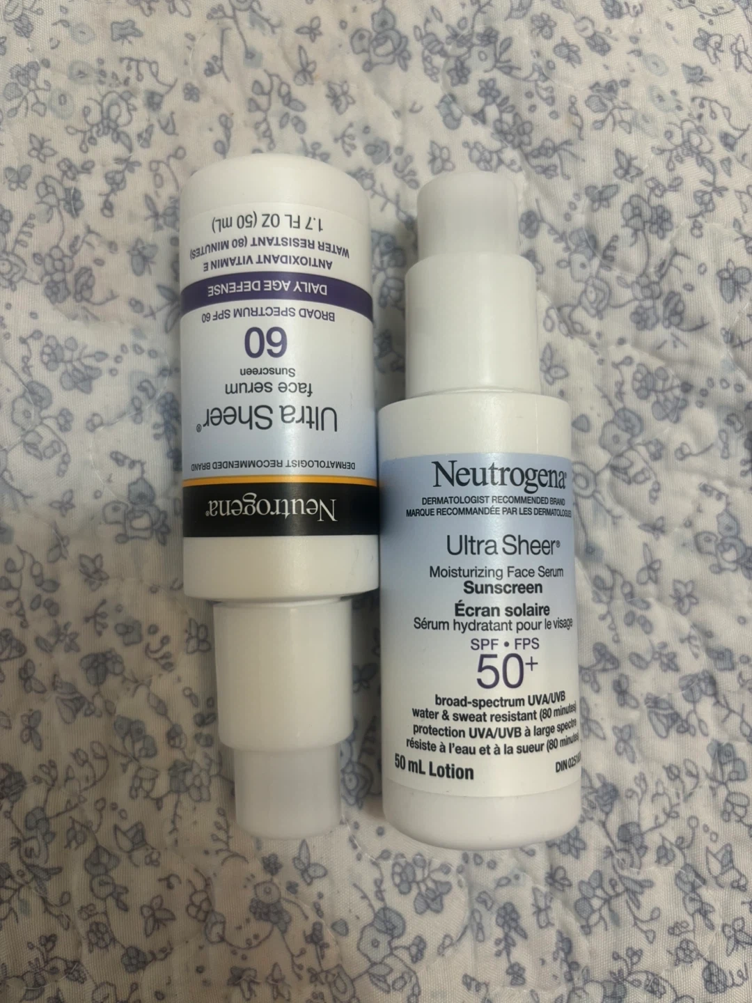 192Selling two brand new bottles of Neutrogena Ultra Sheer face serum sunscreen. One is SPF 60 and the other is SPF 50+. Both are 50 mL lotions. Expiry dates are 2027 May and 2026 November. Original price is $13 for each.