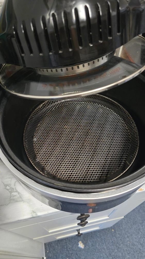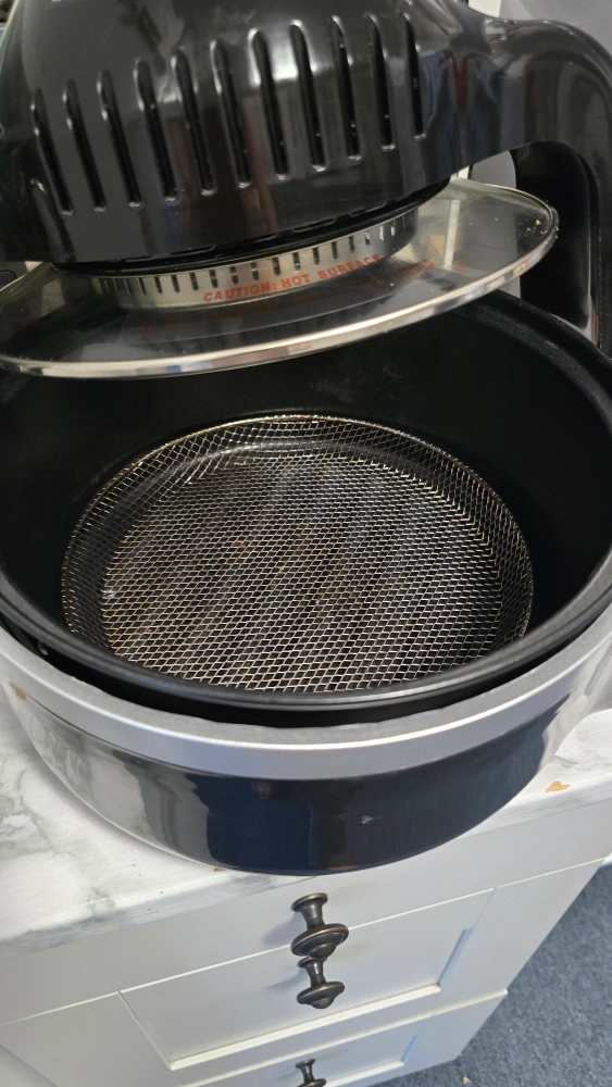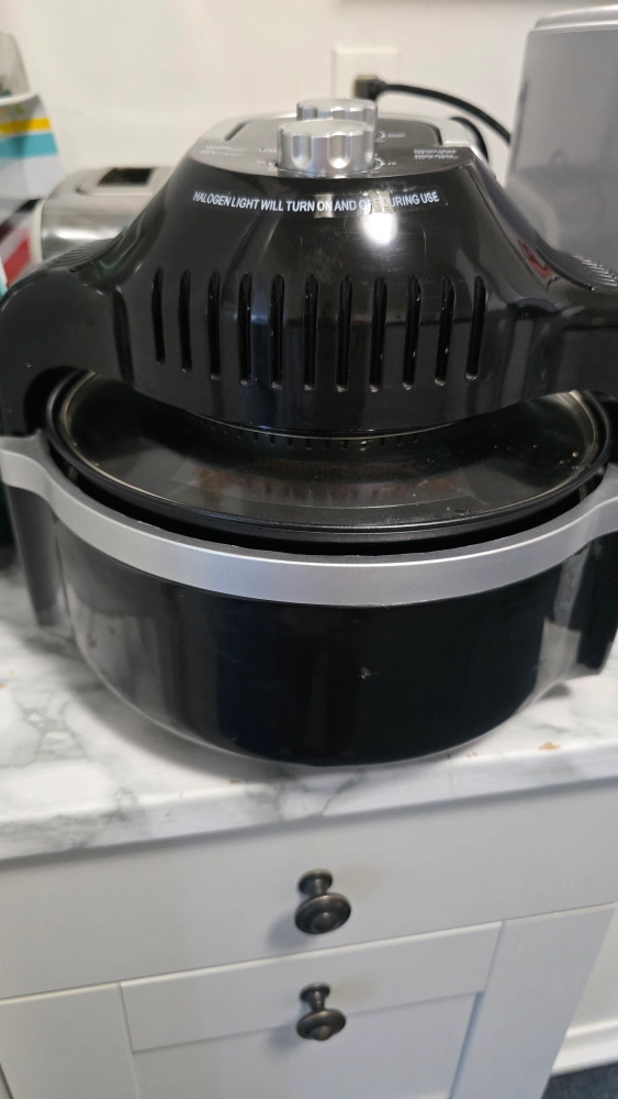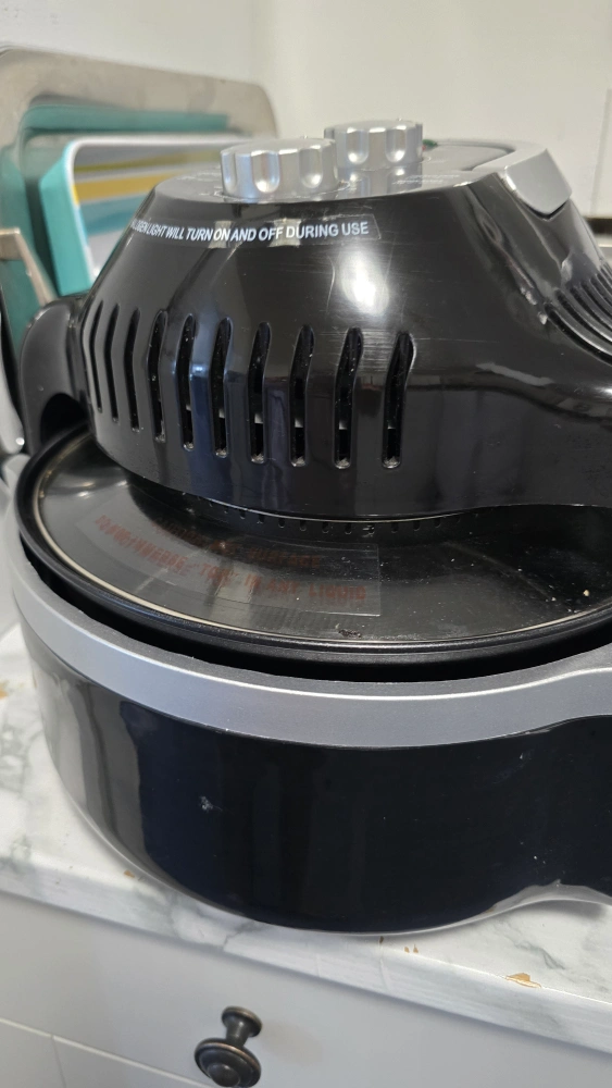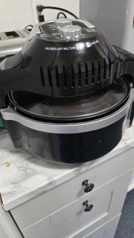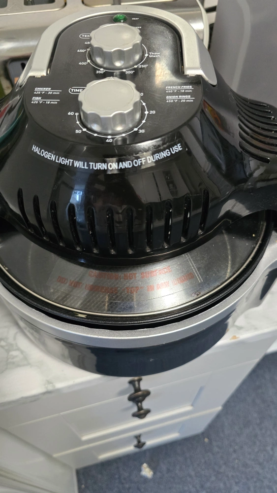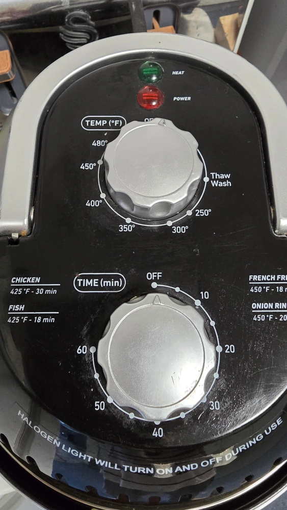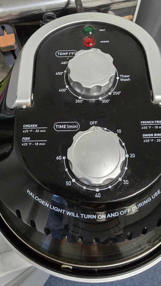 35Selling a used air fryer. It has temperature and time controls for various dishes like chicken, fish, and fries. The fryer also features a halogen light that turns on and off during use