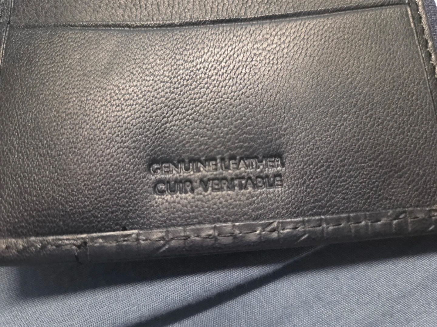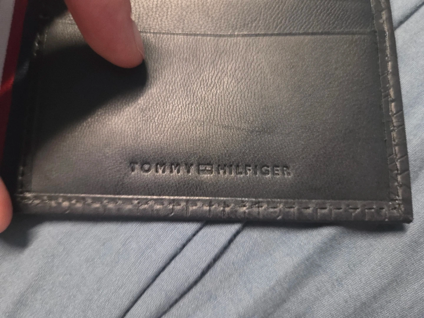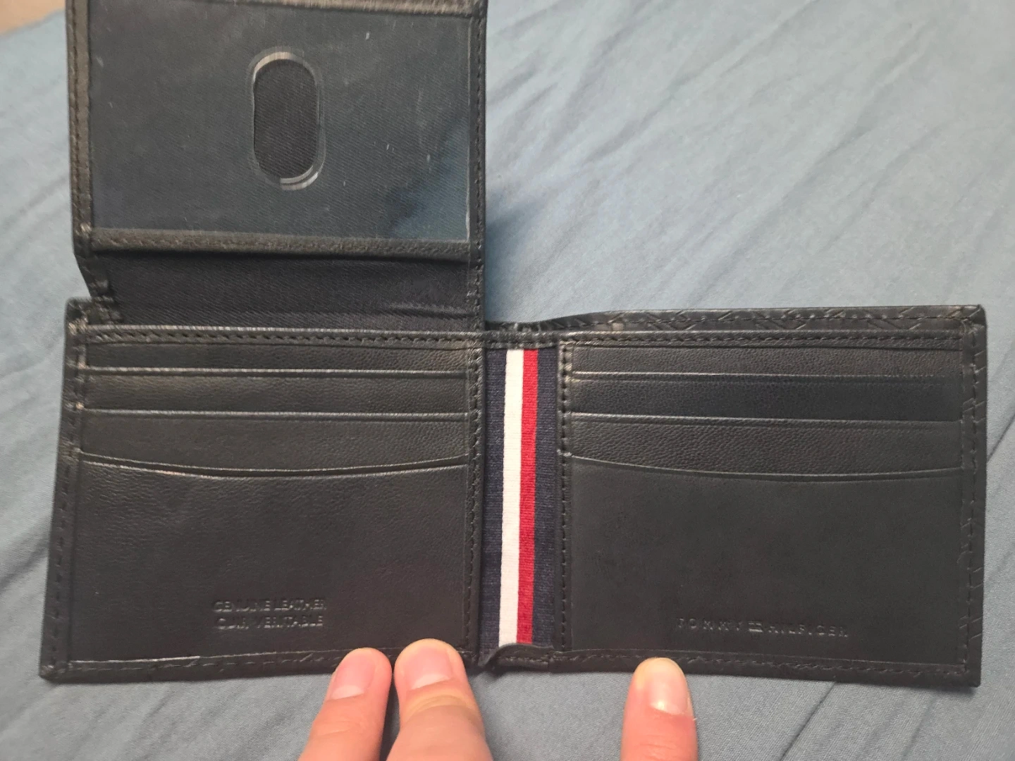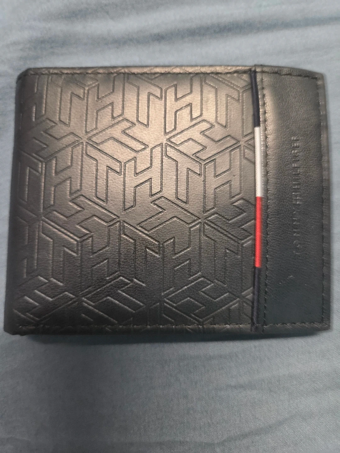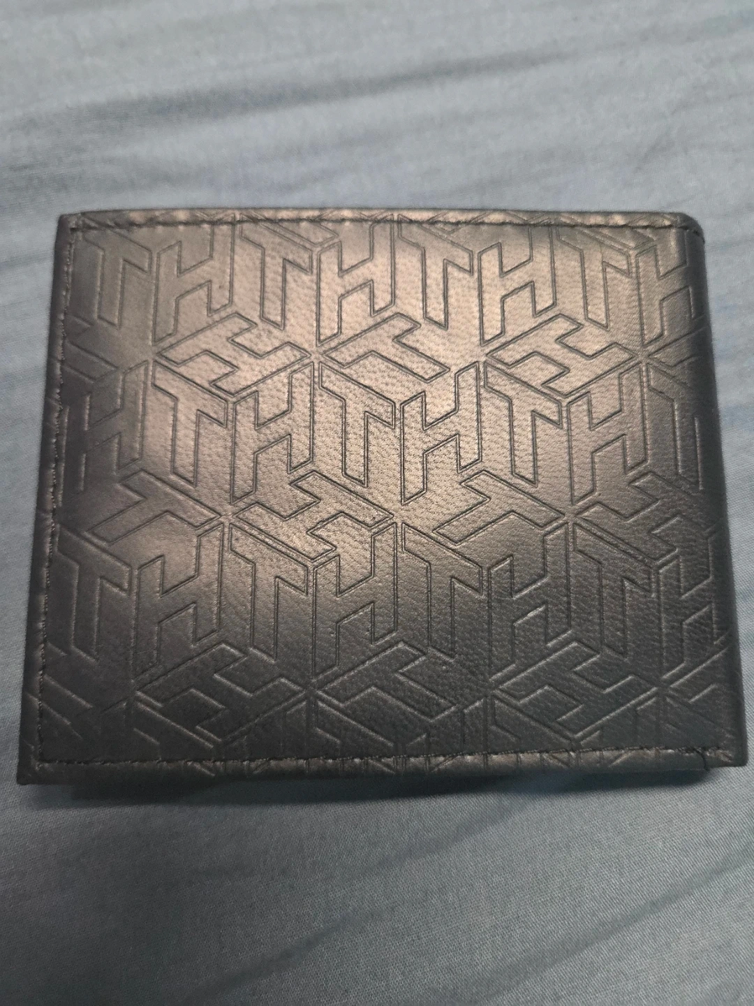 This is a black Tommy Hilfiger bifold wallet. It's made of genuine leather and features multiple card slots and a clear ID window. The exterior has a geometric TH monogram pattern.
