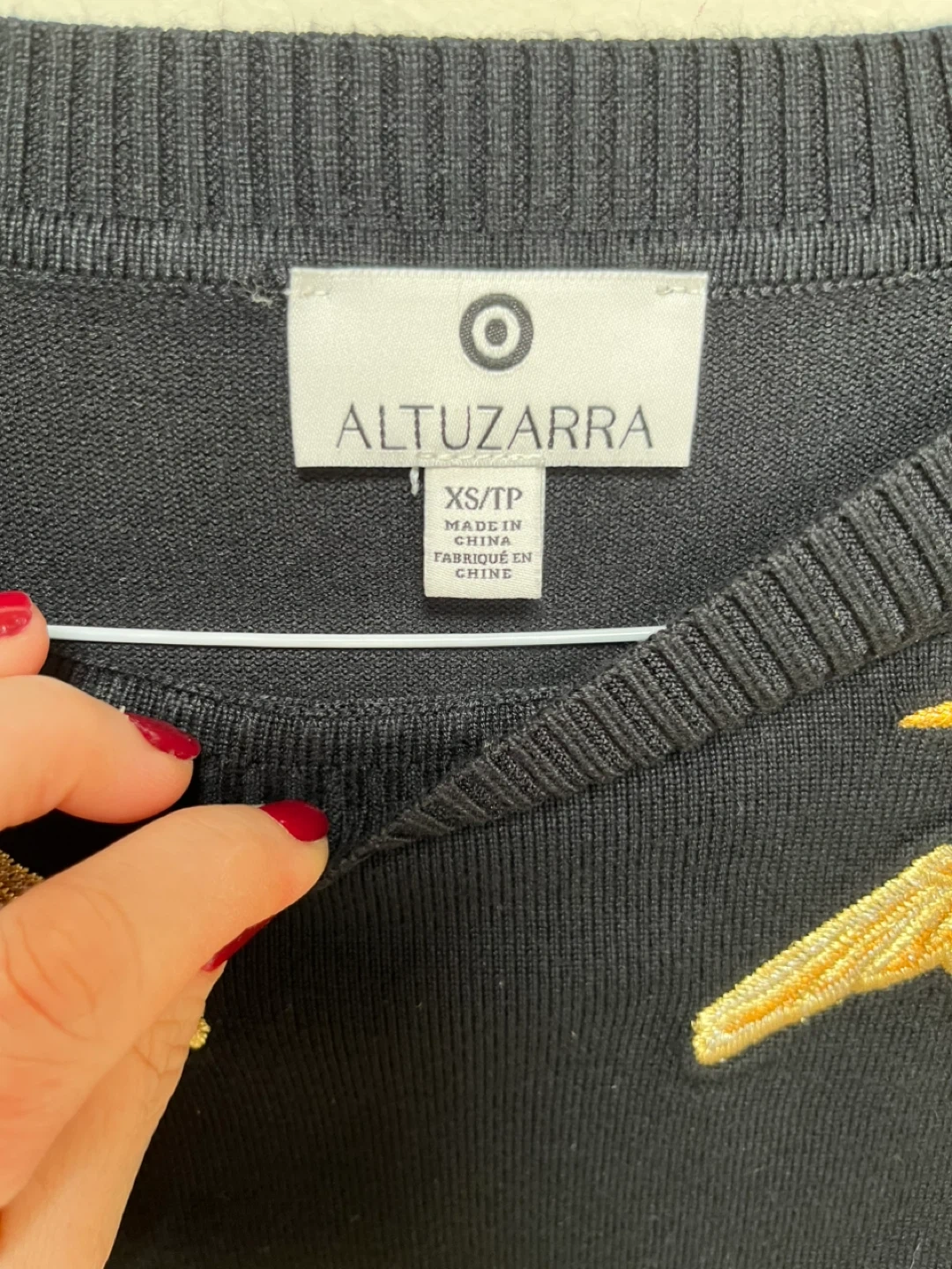 This black sweater features a crew neck and intricate gold crane embroidery on the shoulders. It's made from a blend of rayon and nylon. The size is XS/TP.
