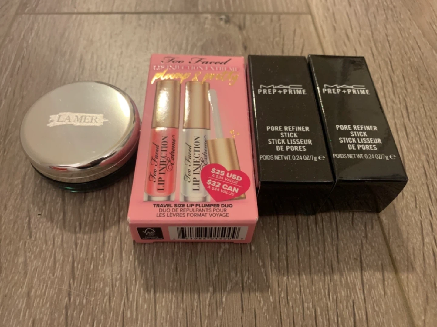 A trio of beauty items including La Mer, Too Faced Lip Injection Extreme duo, and two MAC Prep + Prime Pore Refiner Sticks. Each MAC stick is 0.24 oz/7g. The Too Faced duo is travel size. This collection is great for makeup enthusiasts looking to try different brands.