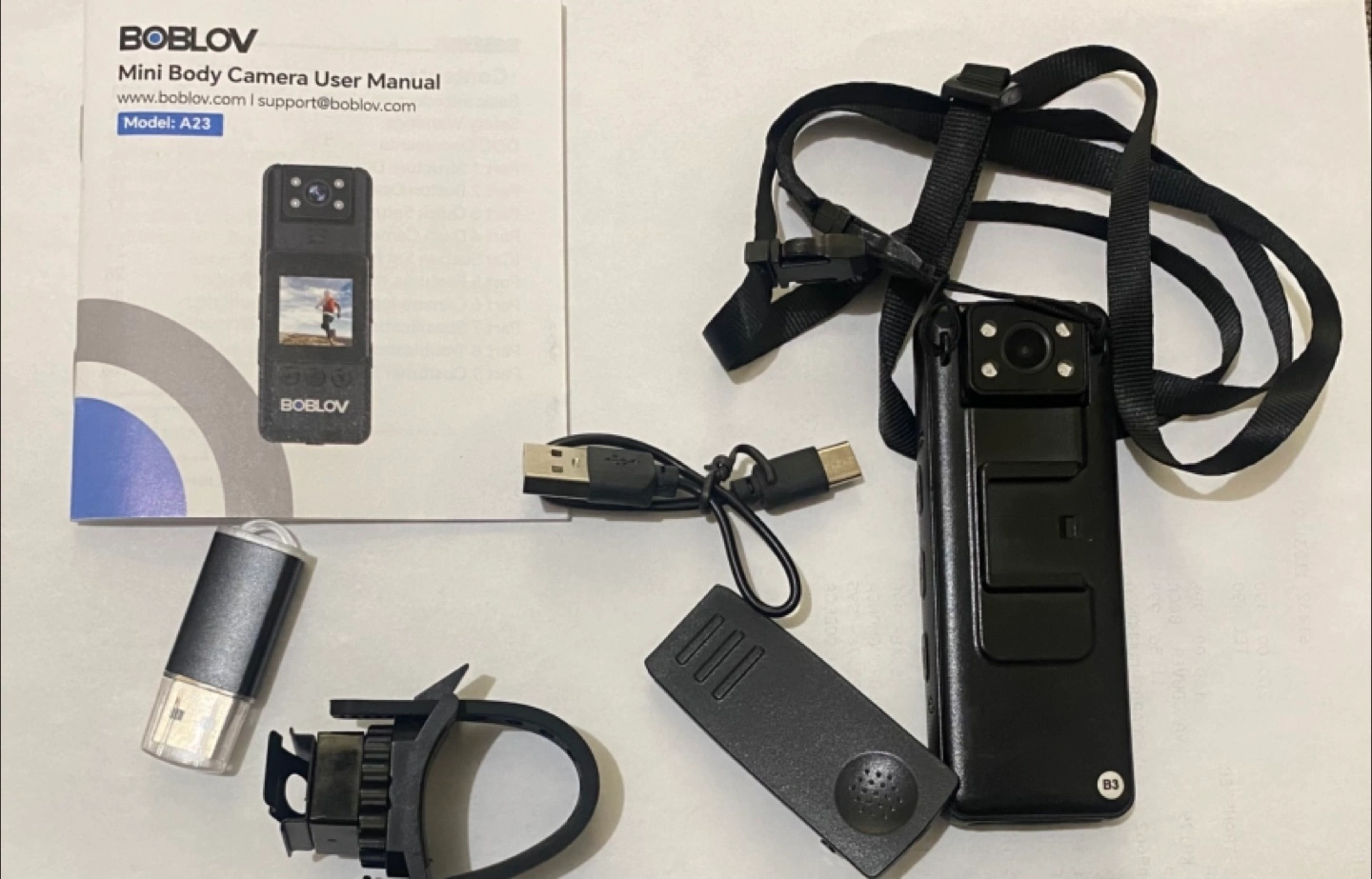 Selling a BOBLOV body camera that comes with all the accessories you see in the photos! It includes the camera itself, a clip, a USB cable, and a mount. It's in great condition and ready to use for your needs