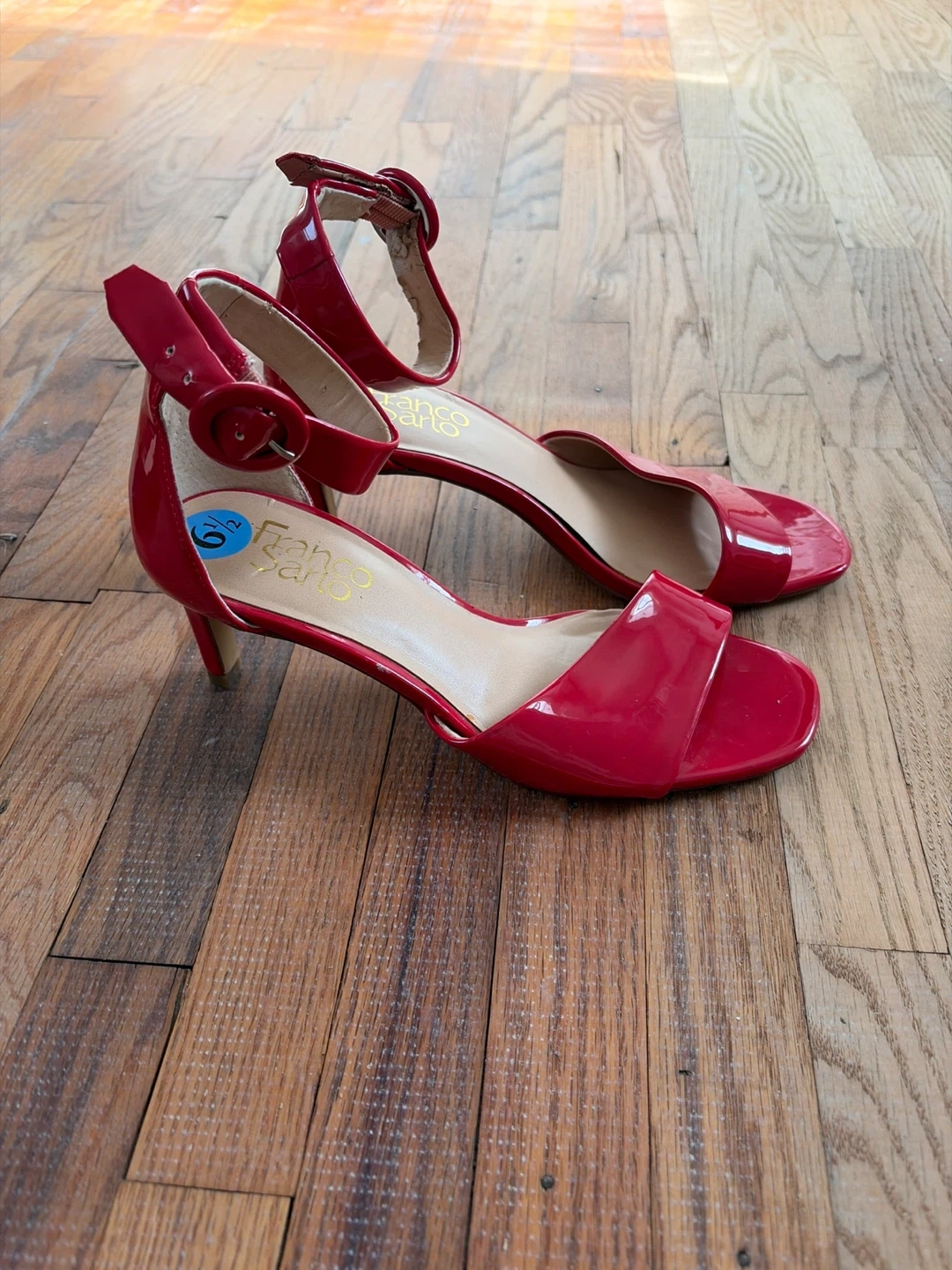 Franco Sarto red patent leather heels with an ankle strap. They're a size 6.5 and feature a buckle closure. Shiny red finish!