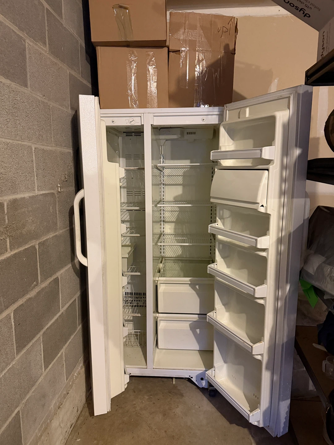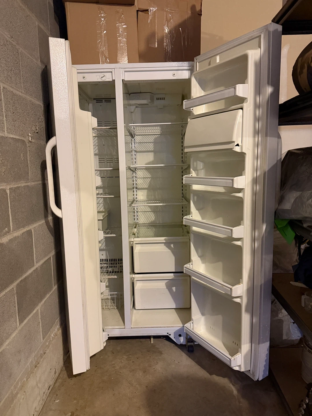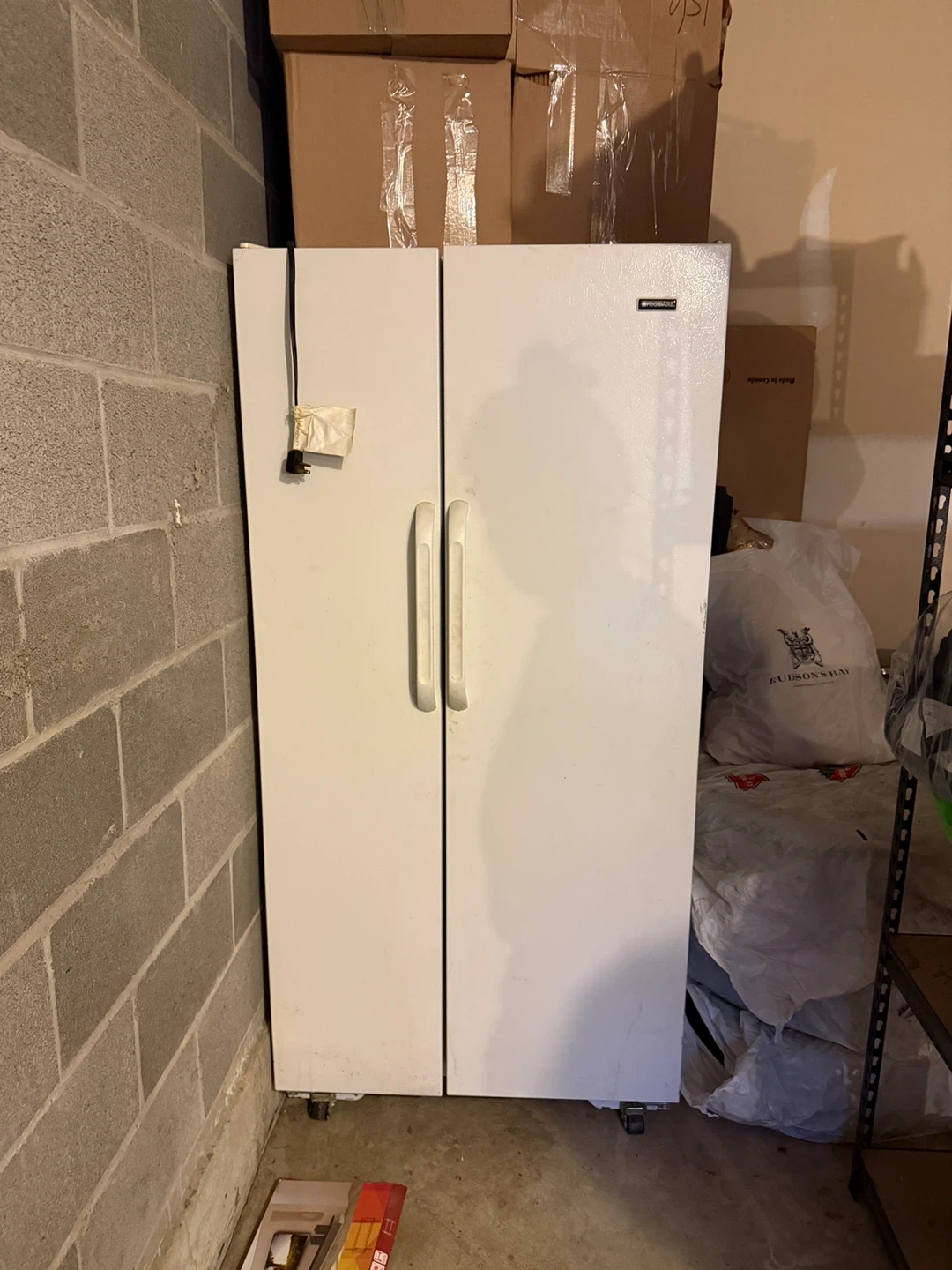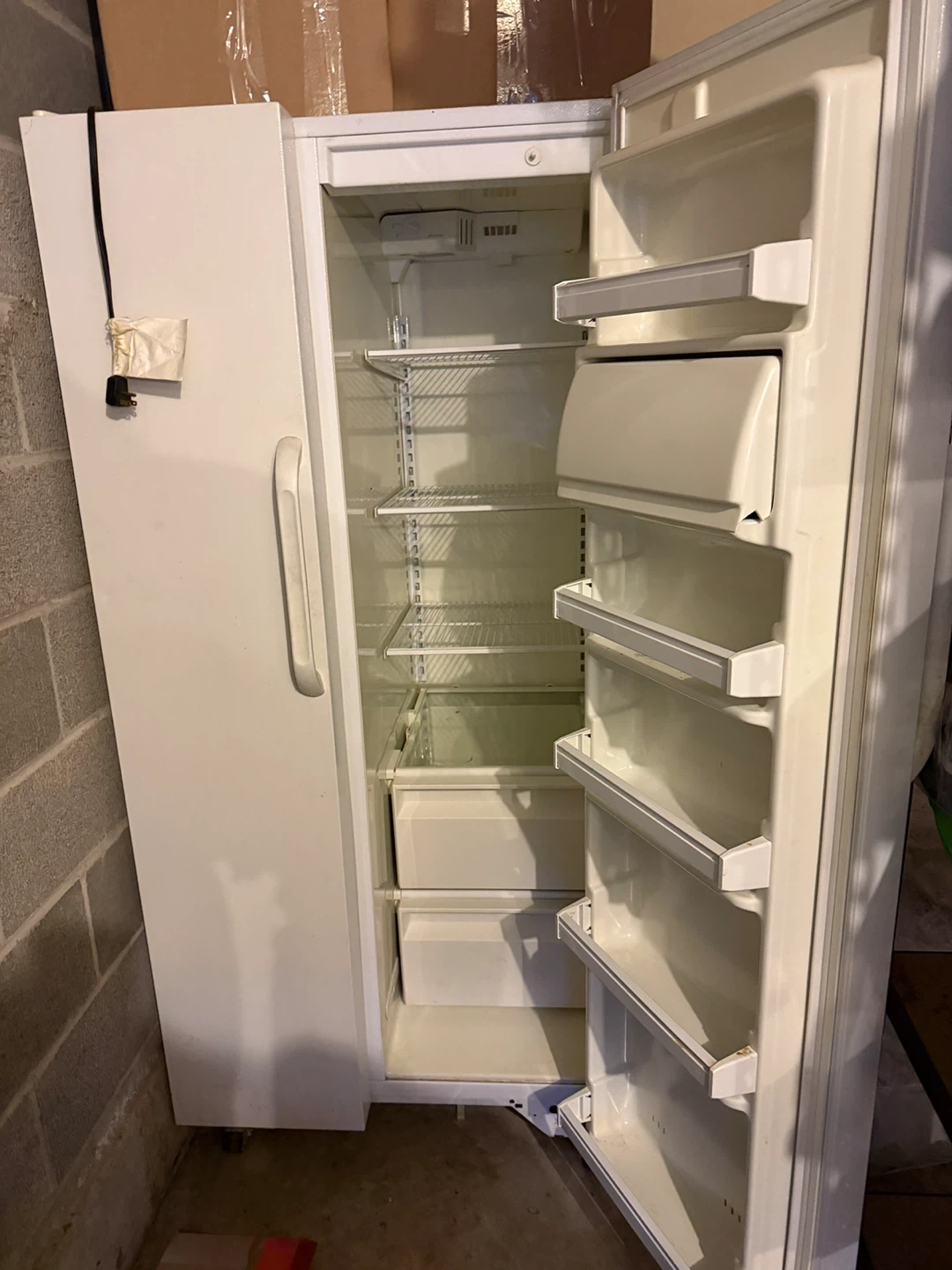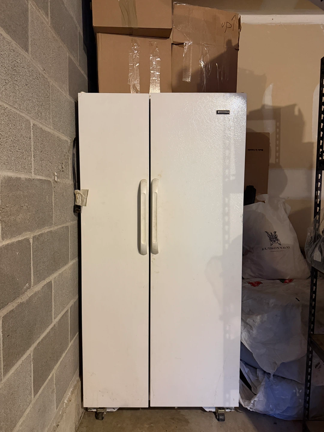 White Frigidaire refrigerator and freezer combo. It has multiple shelves and drawers for storage. Great for extra cold storage in a garage or basement!