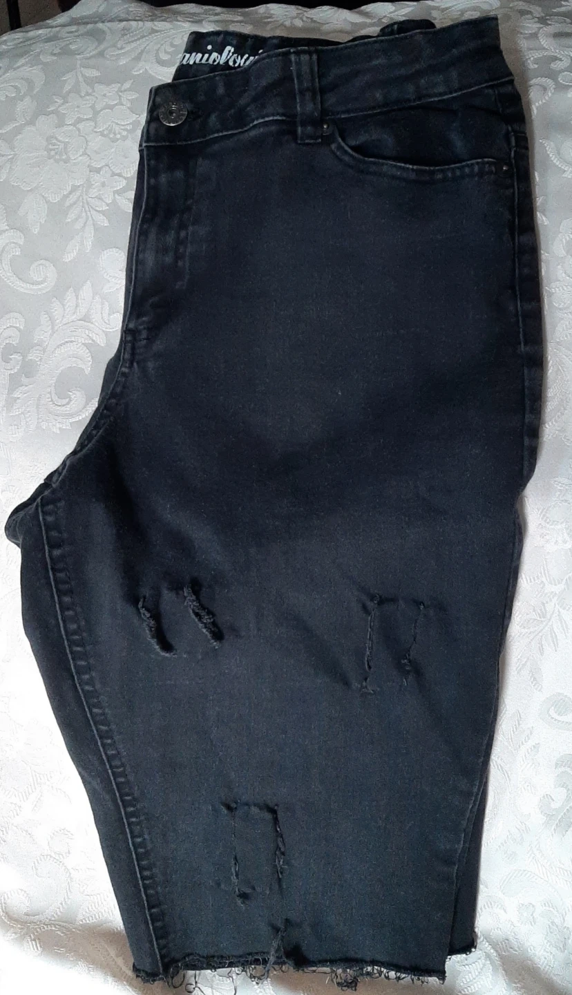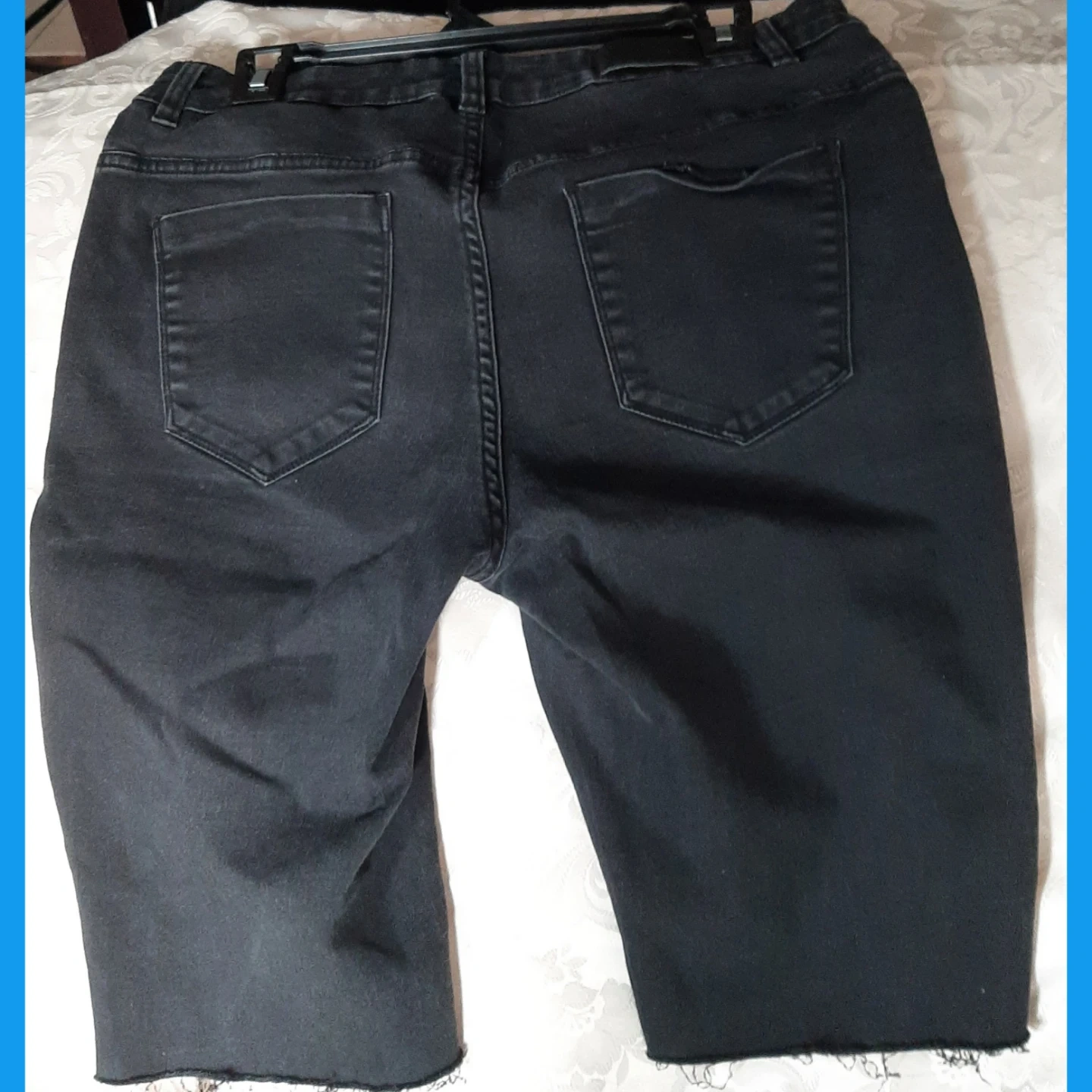 These high rise black denim shorts feature a raw hem and distressed details. They're made of cotton for comfort. A great casual option for warmer weather! Size 12