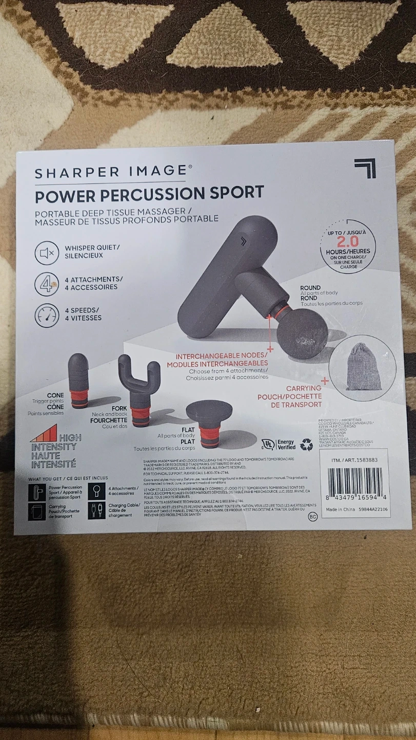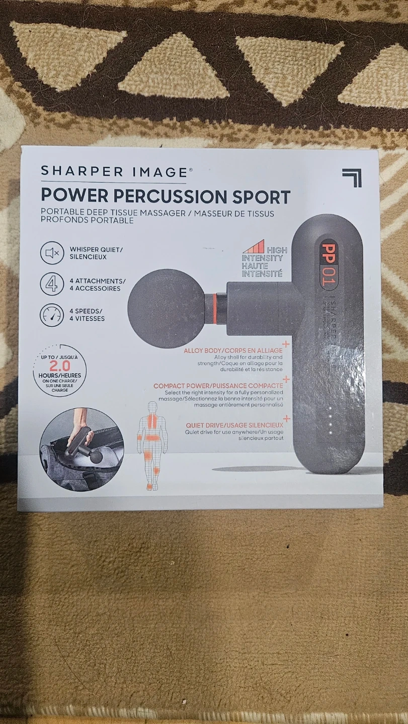 This Sharper Image Power Percussion Sport is a portable deep tissue massager. It's whisper quiet and comes with 4 attachments and 4 speeds. Includes a carrying pouch.