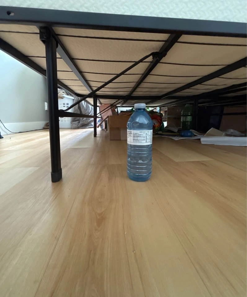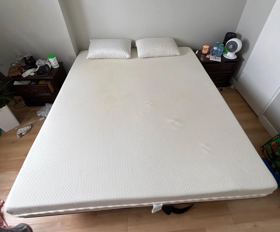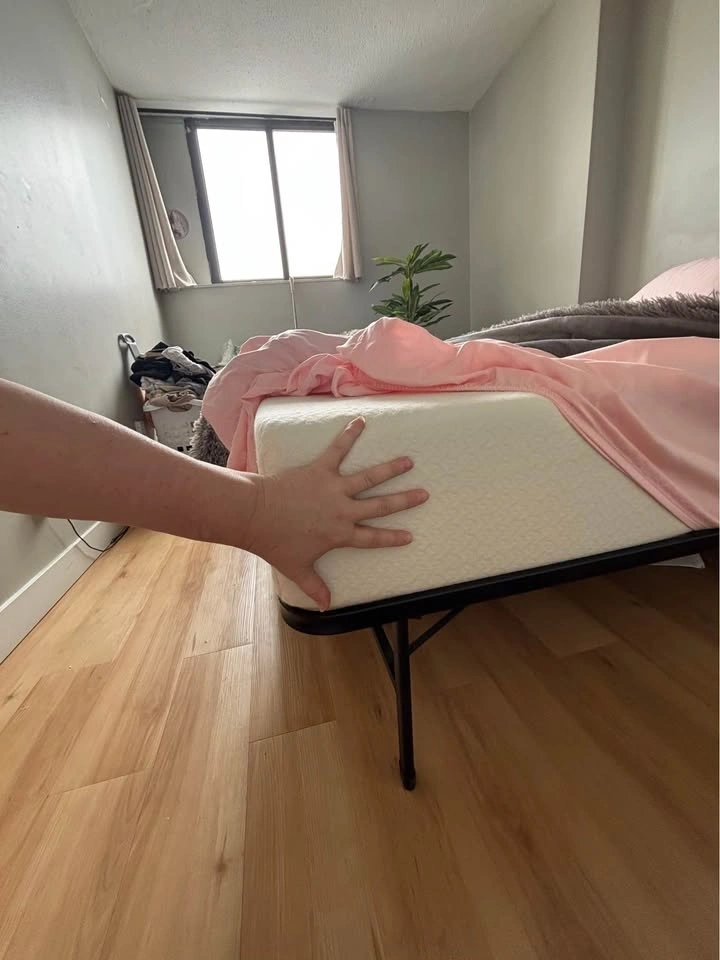 Selling a California King size foam mattress and sturdy metal platform bed frame. This is a high-quality foam mattress from The Foam Store (Kitchener) — not a budget mattress. It is still very supportive and comfortable with excellent shape retention. See photos showing foam compression and immediate bounce-back. Mattress: 83” L x 71” W x 8” thick. Platform height: 13” off the floor (great for storage). Mattress was always used with a protector, is clean, well cared for, has high-resilience foam (still very supportive), and no sagging. Bed frame is a strong metal platform (no box spring needed), very sturdy and stable, and provides excellent under-bed storage space. Bonus: Grey comforter included. Pickup only – no delivery. Mattress has been rolled and zip tied and platform has been disassembled. Mattress is heavy — you will need 2 people to move it. Located in Kitchener.