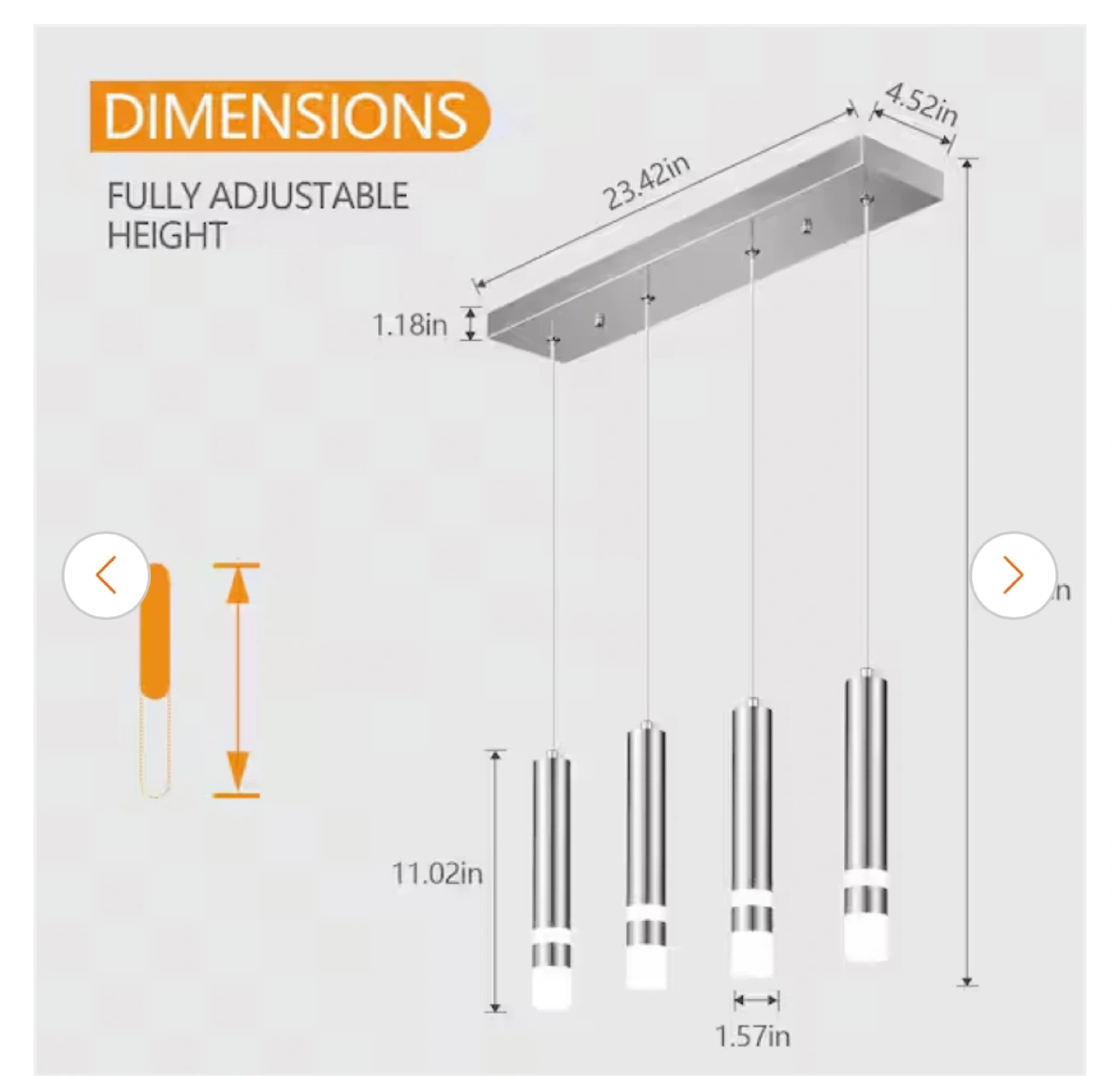 This chrome LED mini pendant light features a modern design with aluminum tubes and acrylic shades. It's 1.57 in. wide x 11.02 in. high, with a base that's 4.72 in. wide. It comes with an adjustable cord up to 62.99 in. for flexible hanging heights. Built-in with a 6W LED chip, it offers 4000K natural light and supports 0-100% dimming. This light fixture would be great for illuminating a kitchen island or dining area.
