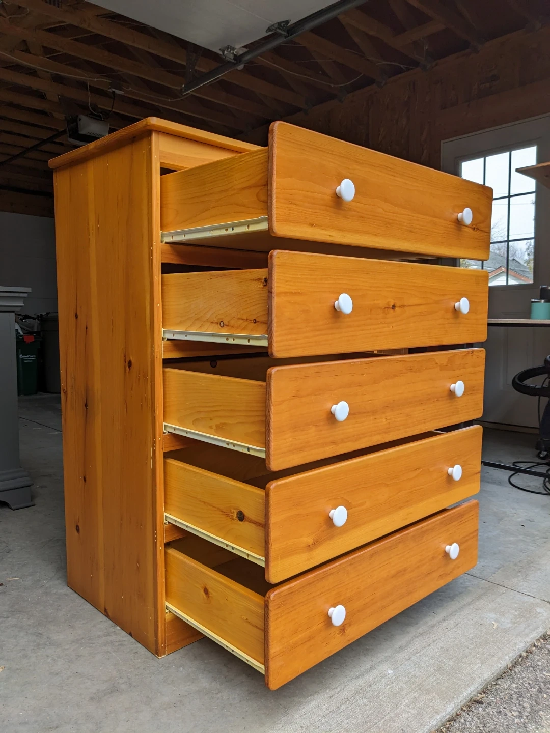 This 5 drawer tallboy dresser in solid pine features spacious drawers that all open and close perfectly on their metal slides with safety stop system. The drawer pulls are made of durable white porcelain.