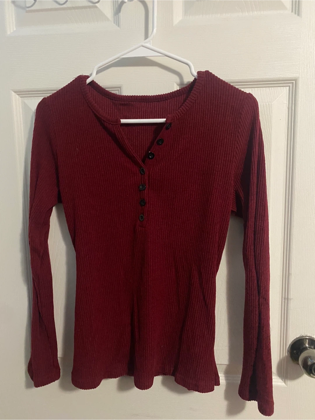 This burgundy long-sleeve henley shirt has a ribbed texture and a four-button placket. It's made from a comfortable, stretchy fabric. Perfect for layering or wearing on its own!