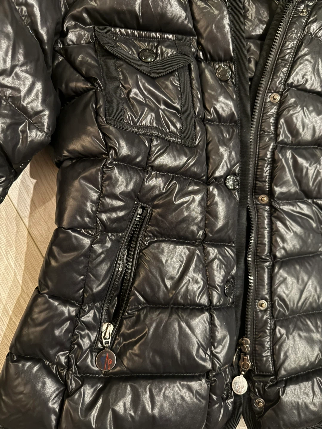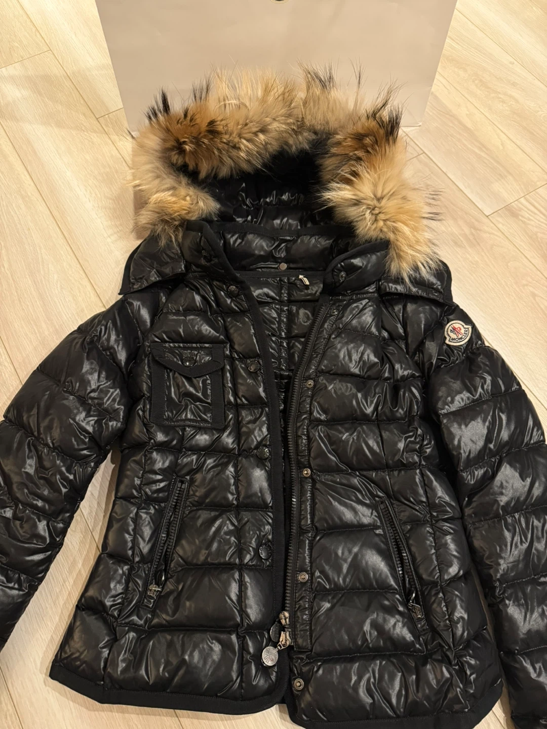 Selling a stylish Moncler black down puffer jacket. It's in great condition and features a fur-trimmed hood that is removable, perfect for staying warm and fashionable during the colder months.