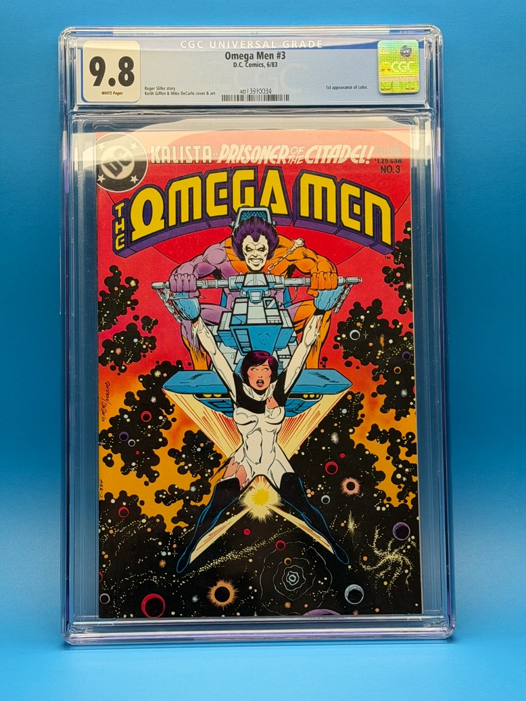 CGC Universal Grade Omega Men #3 comic book. Features a 9.8 grade with white pages. This issue is from D.C. Comics, dated 6/83. It includes the 1st appearance of Lobo.