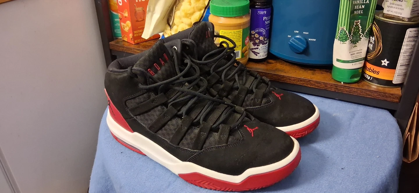 Black and red high-top Jordan basketball shoes. Lace-up closure. Features the iconic Jumpman logo. These sneakers offer good support for athletic activities.