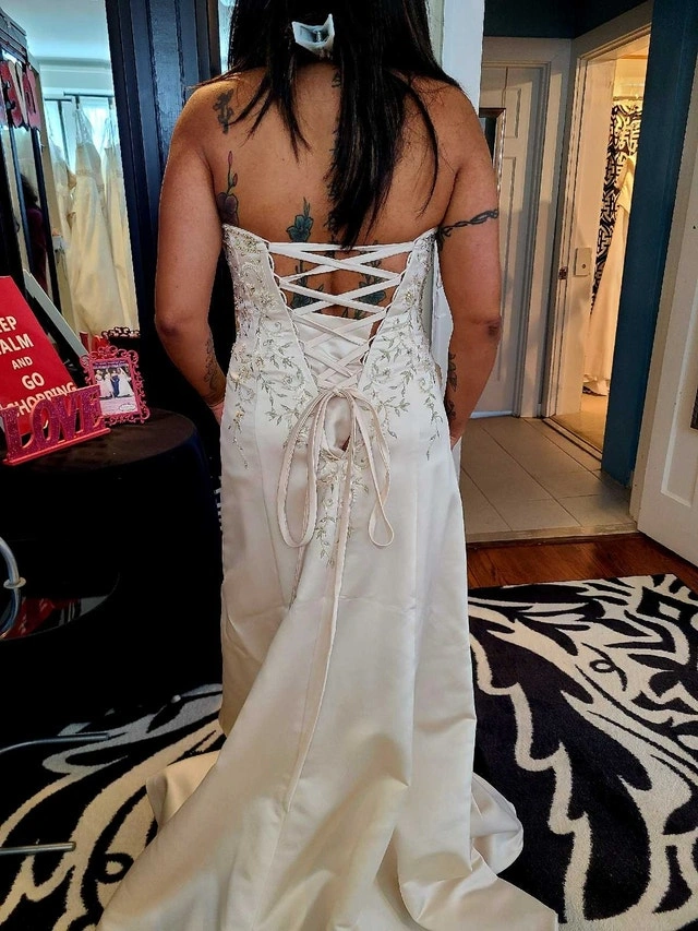 Sample Size 12 (fits like a size 10) Ivory, Halter, with back corset, satin gown with beading on bust and mid-section. Only the hem was altered. I'm 5ft and wore 3" heels. The back has a corset with a removable panel, so it can be worn with or without. Fits great if you have a larger back. It has been dry cleaned and preserved. Asking $600 or best offer. Pick up near Burlington Mall.