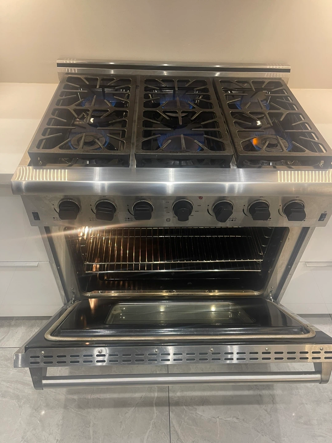 This is a 6-burner gas range with a stainless steel finish. It includes a gas oven with a visible oven rack. The burners are lit and functioning. This range is suitable for a busy kitchen.