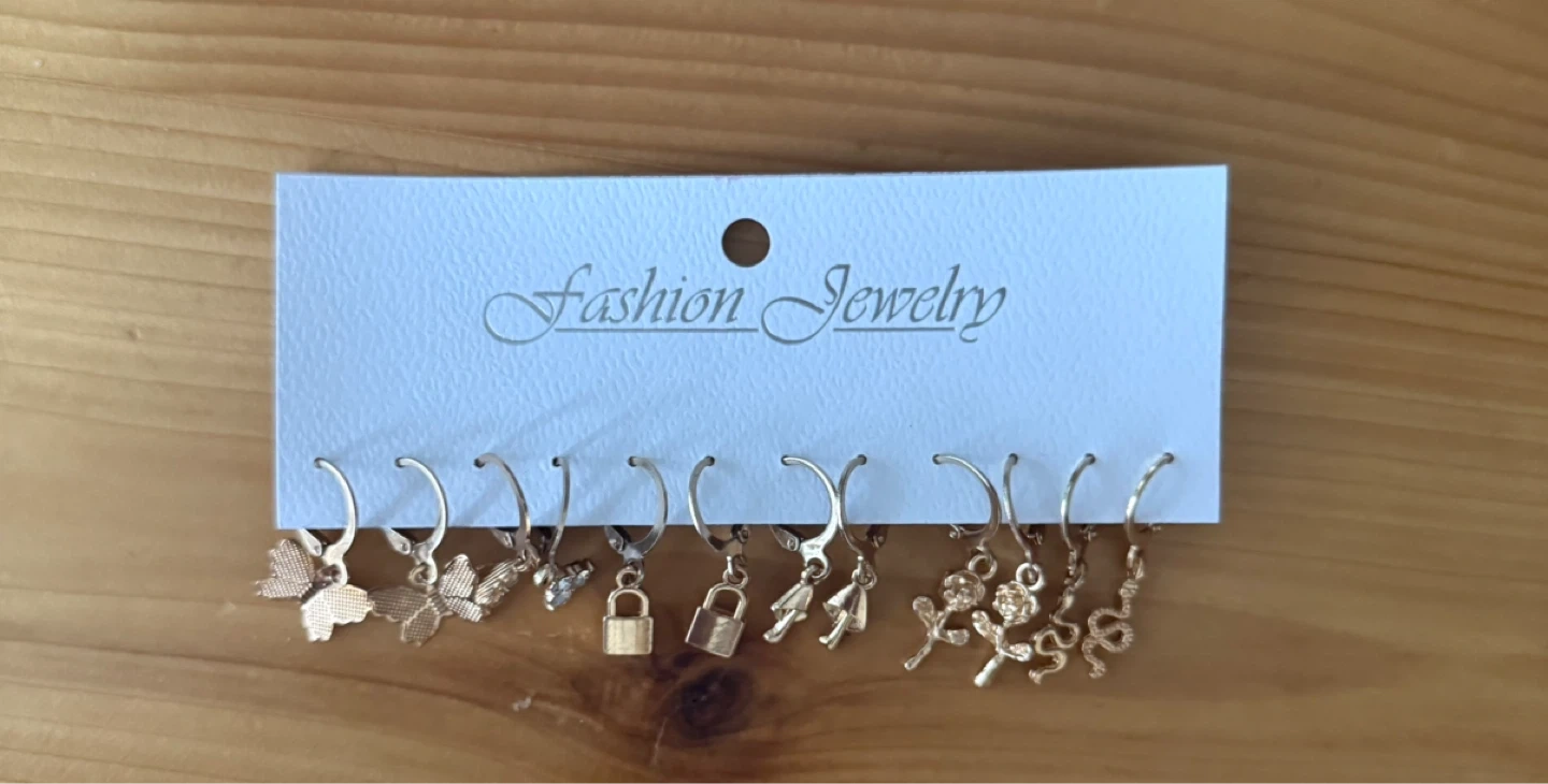 A set of six pairs of hoop earrings with various charms including butterflies, locks, and flowers.